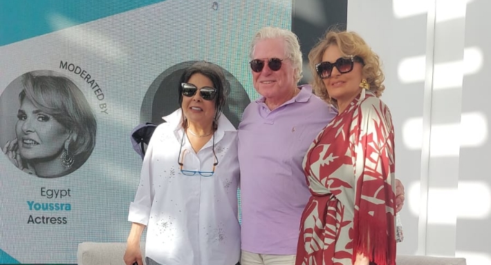 إسعاد يونس وحسين فهمي ويسراقبل بدء جلسة حوارية بمهرجان الجونة