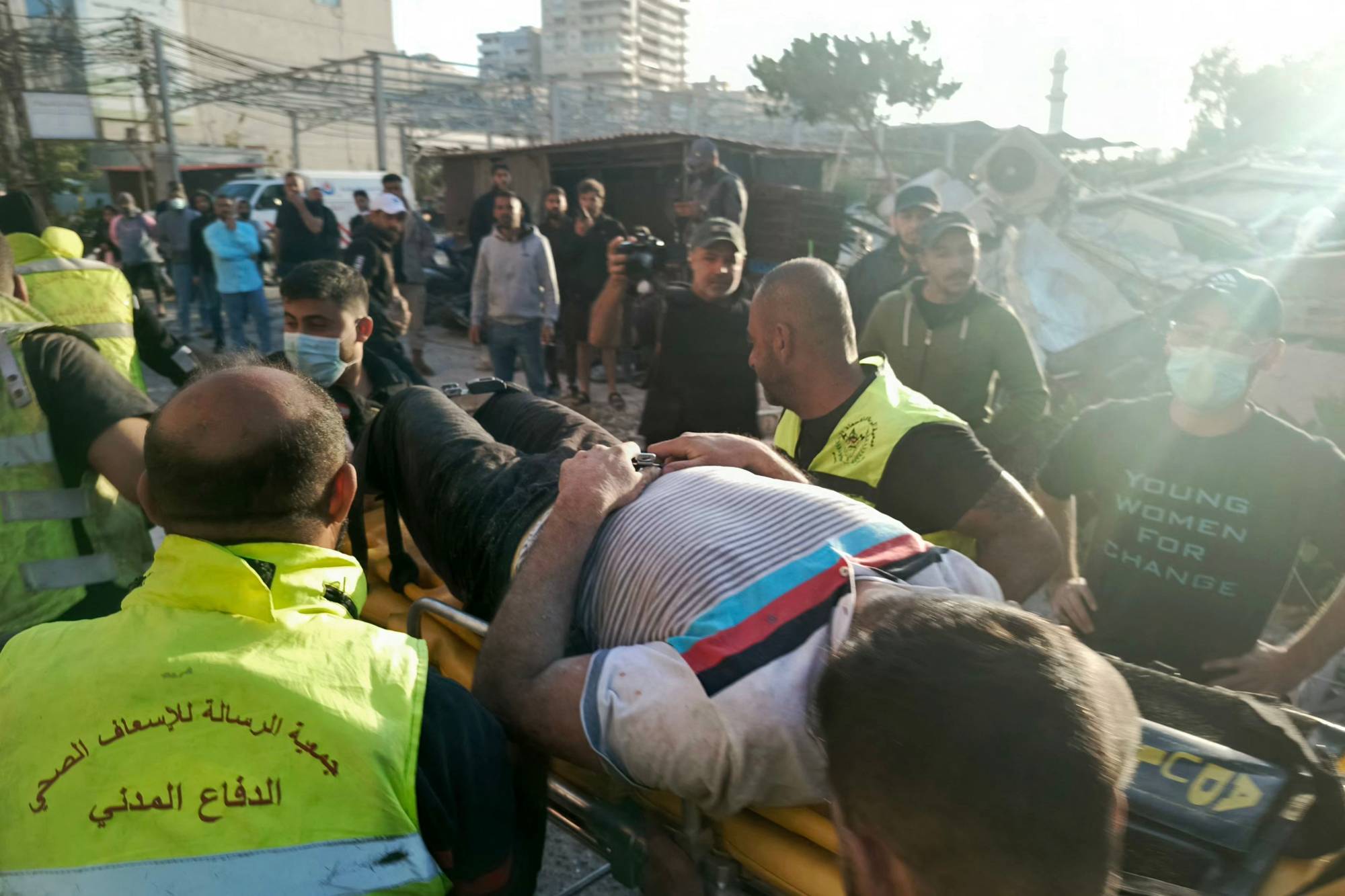 عمال إنقاذ ينقلون مصاباً من موقع استهداف إسرائيلي في مدينة صور (أ.ف.ب)