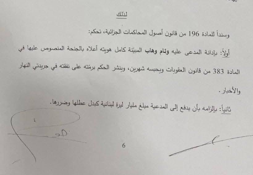 قضى الحكم بإدانة وهاب، وسجنه لمدة شهرين، بالإضافة إلى تغريمه مبلغ مليار ليرة لبنانية تعويضاً عن الأضرار المعنوية التي لحقت بالقاضية نتيجة العبارات التي نشرها عبر وسائل التواصل الاجتماعي.