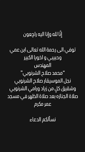 وكتب محمد الشرنوبي عبر حسابه على Instagram: “إنا لله وإنا إليه راجعون، توفي إلى رحمة الله تعالى ابن عمي وحبيبي وأخويا الكبير محمد صلاح الشرنوبي، نجل الموسيقار صلاح الشرنوبي، وشقيق كل من زياد ورامي الشرنوبي”.