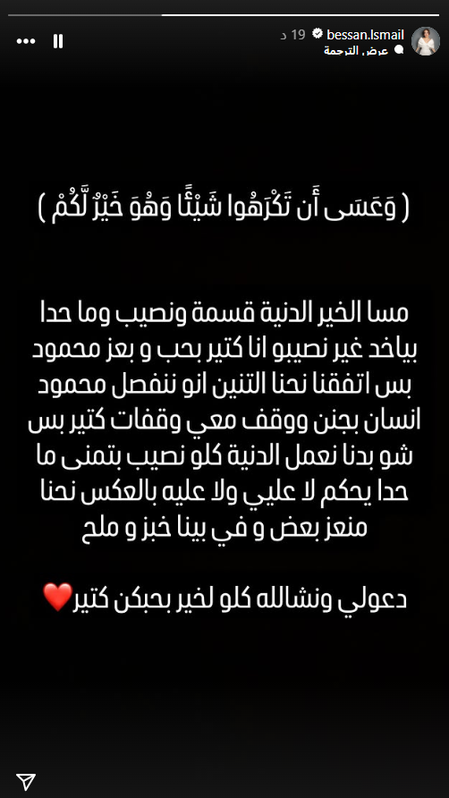 وأعلنت بيسان إسماعيل الخبر رسمياً عبر “ستوري” في صفحتها الشخصية على “انستغرام”، إذ كتبت: “مسا الخير الدنيا قسمة ونصيب وما حدا بياخد غير نصيبو أنا كتير بحب وبعز محمود بس اتفقنا نحنا التنين انو ننفصل”.