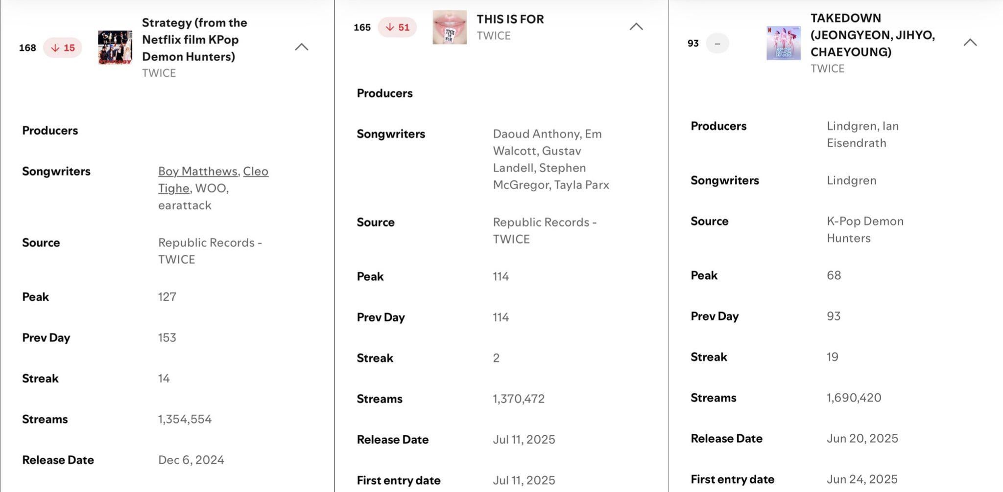 [TWICE] 250713 Global Spotify Charts Update – “هذا هو” من أجل “ينخفض إلى رقم 151 مع 1،370،472 تدفقات مرشح! TIF والاستراتيجية معرضة لخطر ترك المخططات مع الإصدارات الجديدة التي تتولى.