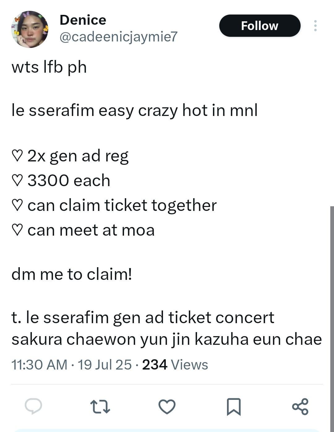 فقط أريد مشاركة هذا إذا كان أي شخص يخطط لمشاهدة حفل Le Sserafim في MOA Arena ، الفلبين ولكن لا يزال ليس لديه تذاكر والتفكير في الشراء عبر الإنترنت.