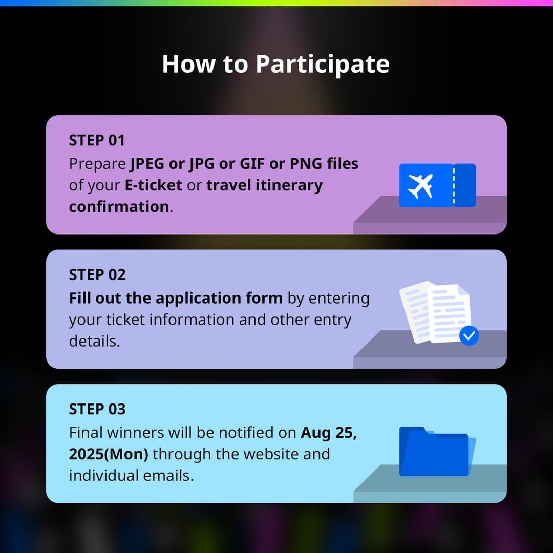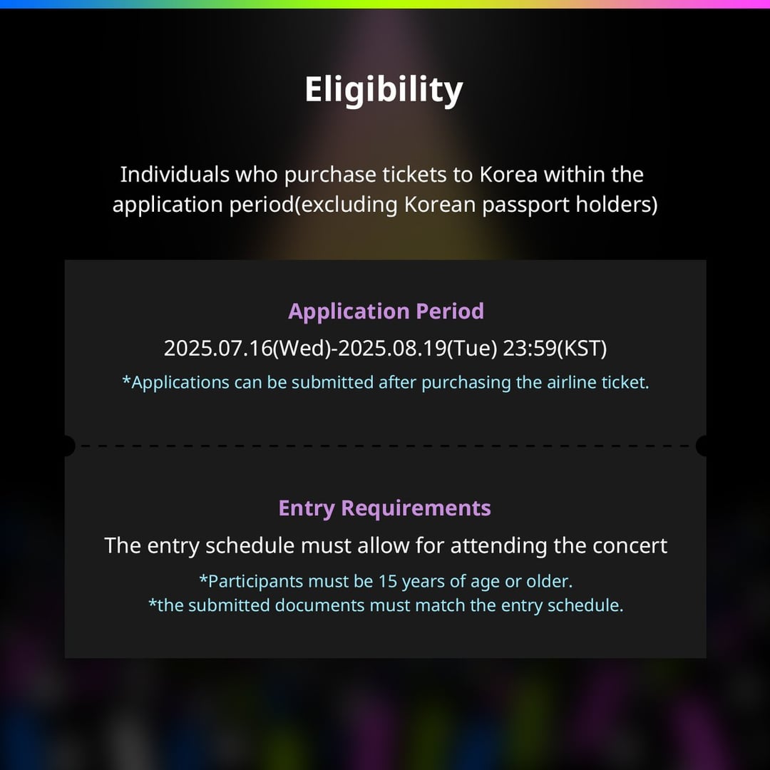 - مفتوح لأي شخص قام بشراء تذكرة طيران إلى كوريا خلال فترة الطلب (حاملي جوازات السفر من بلدان خارج كوريا)