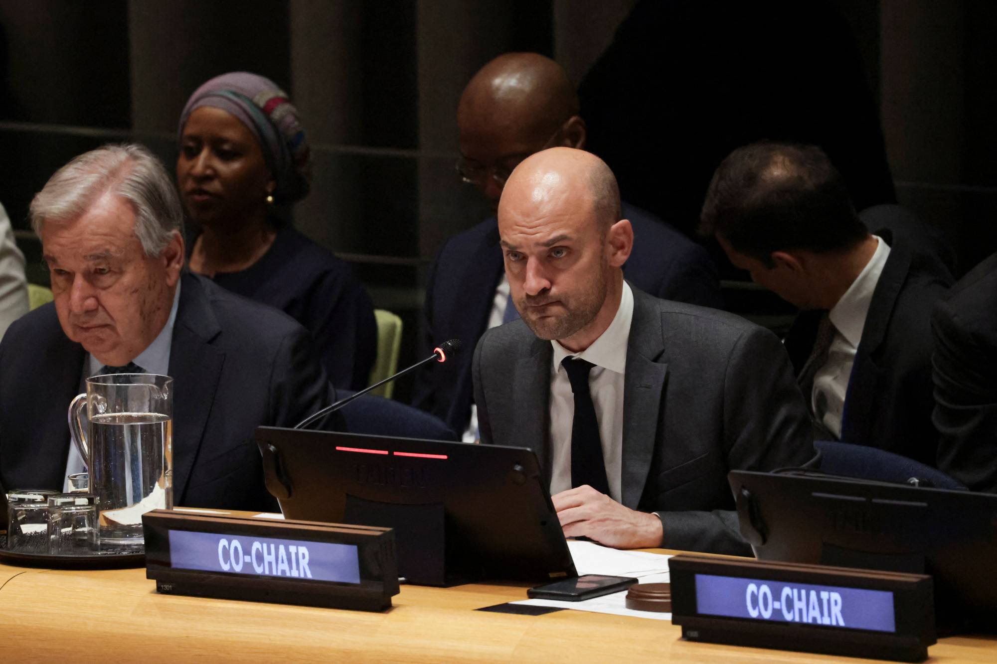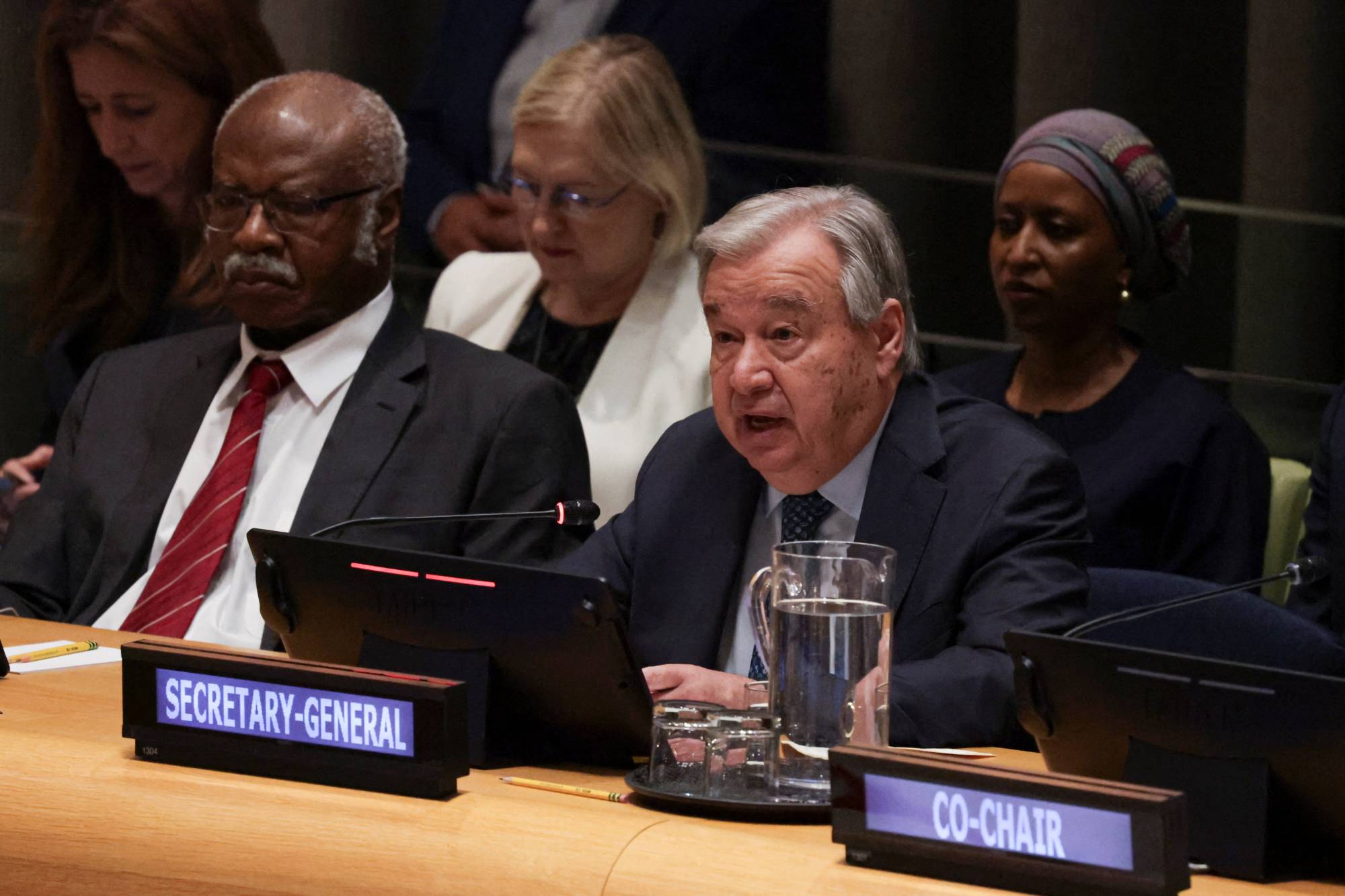 أنطونيو غوتيريش أمين عام الأمم المتحدة متحدثاً في «مؤتمر حل الدولتين»… (رويترز)