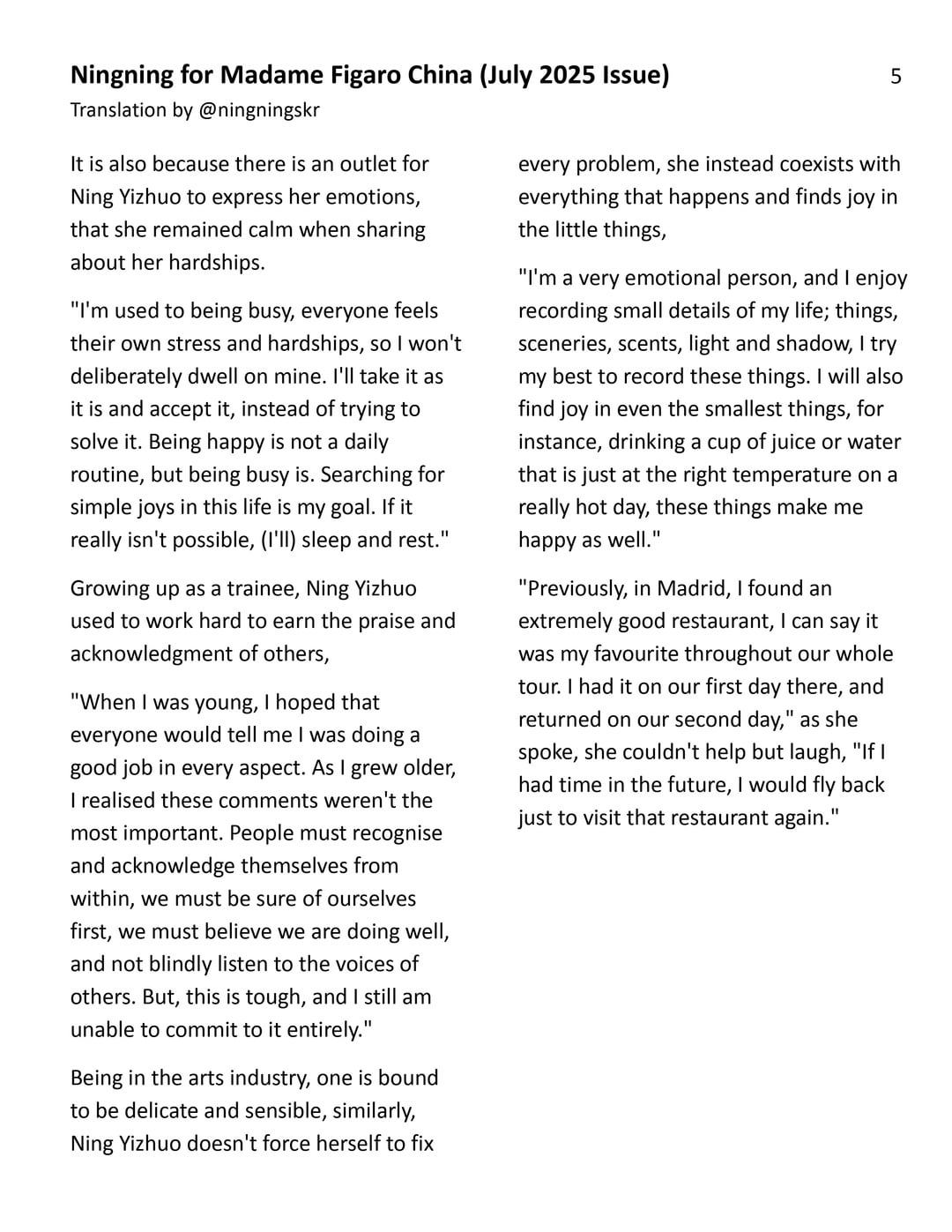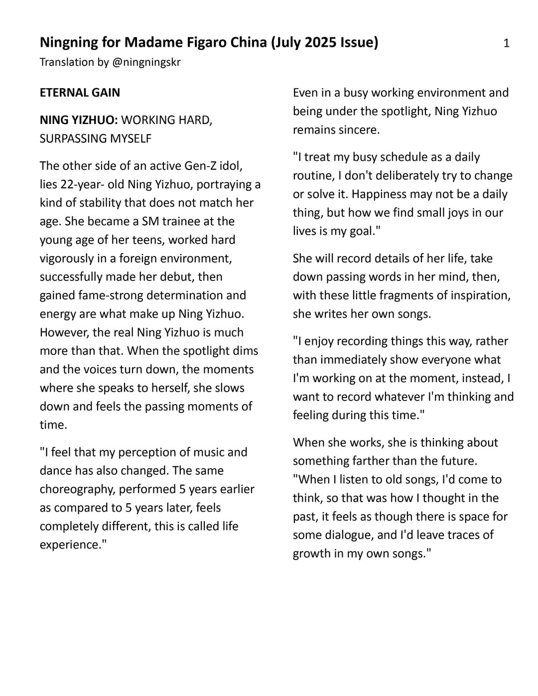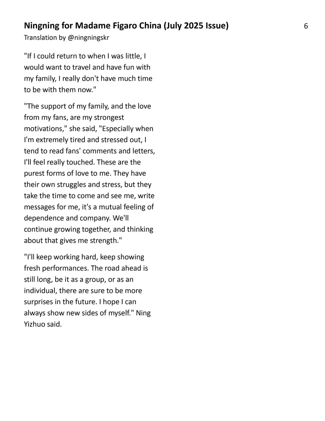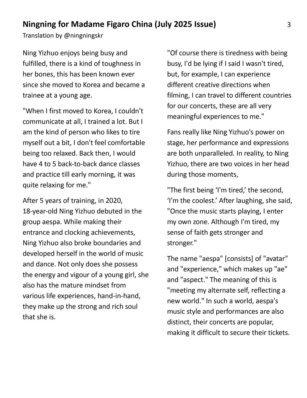 250727 Ningning for Madame Figaro China (يوليو 2025 مقابلة)