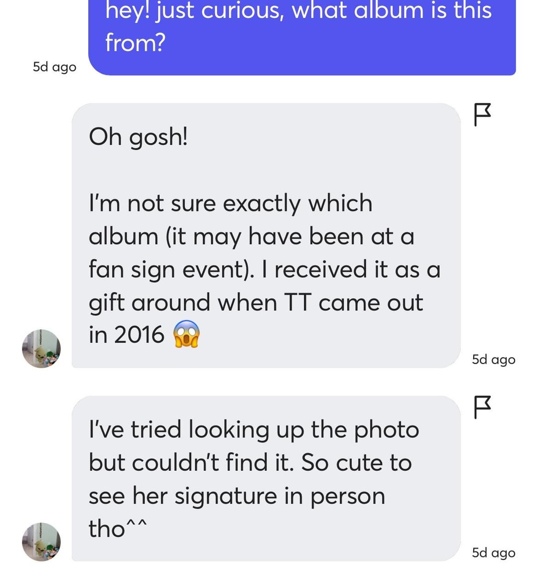 مرحبًا بالجميع ، لقد اشتريت هذه الصورة مؤخرًا بتوقيع Momo عليها. كنت أتساءل عما إذا كنتم يا رفاق تصدقوا أن تكون مزيفًا؟ سألت البائع عن ذلك وهذا ما قالوه في لقطة الشاشة أعلاه. لأكون صادقًا ، لا أمانع حقًا إذا كان الأمر حقيقيًا أم لا لأنني لم أدفع الكثير مقابل ذلك ، لكن من الواضح أنني آمل أن تكون أصيلة. ليس لدي أي سبب للاعتقاد بأنهم يكذبون ، قائلين إنهم حصلوا عليه عندما انخفض TT في عام 2016 يبدو محددًا إلى حد ما ، لذا فأنا أميل إلى الاعتقاد بأنه أصيل. أيضًا ، عند فتح الصورة من الإطار ، فهي صورة عادية مع علامة Kodak على الظهر وليس بطاقة بريدية. الظهر أيضًا مصفر ، يحتمل أن يكون بسبب العمر؟ إذا كان الأمر كذلك ، فإنه يصطف مع قصتهم المتمثلة في الحصول عليها في عام 2016.