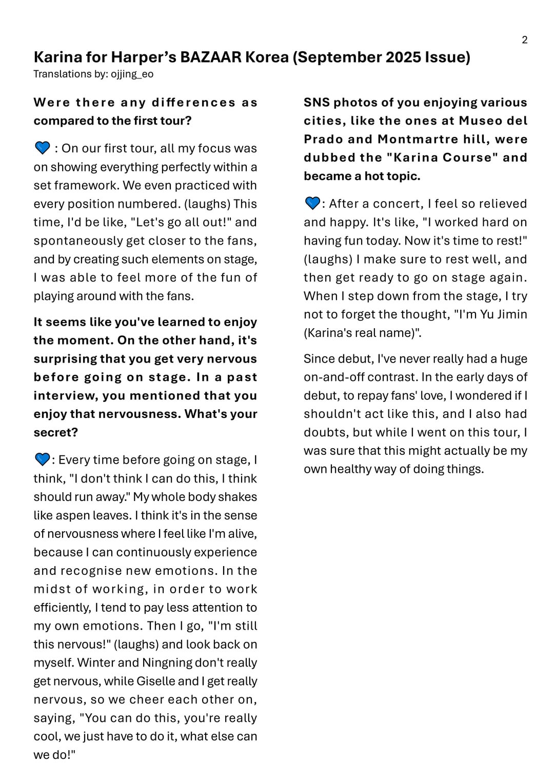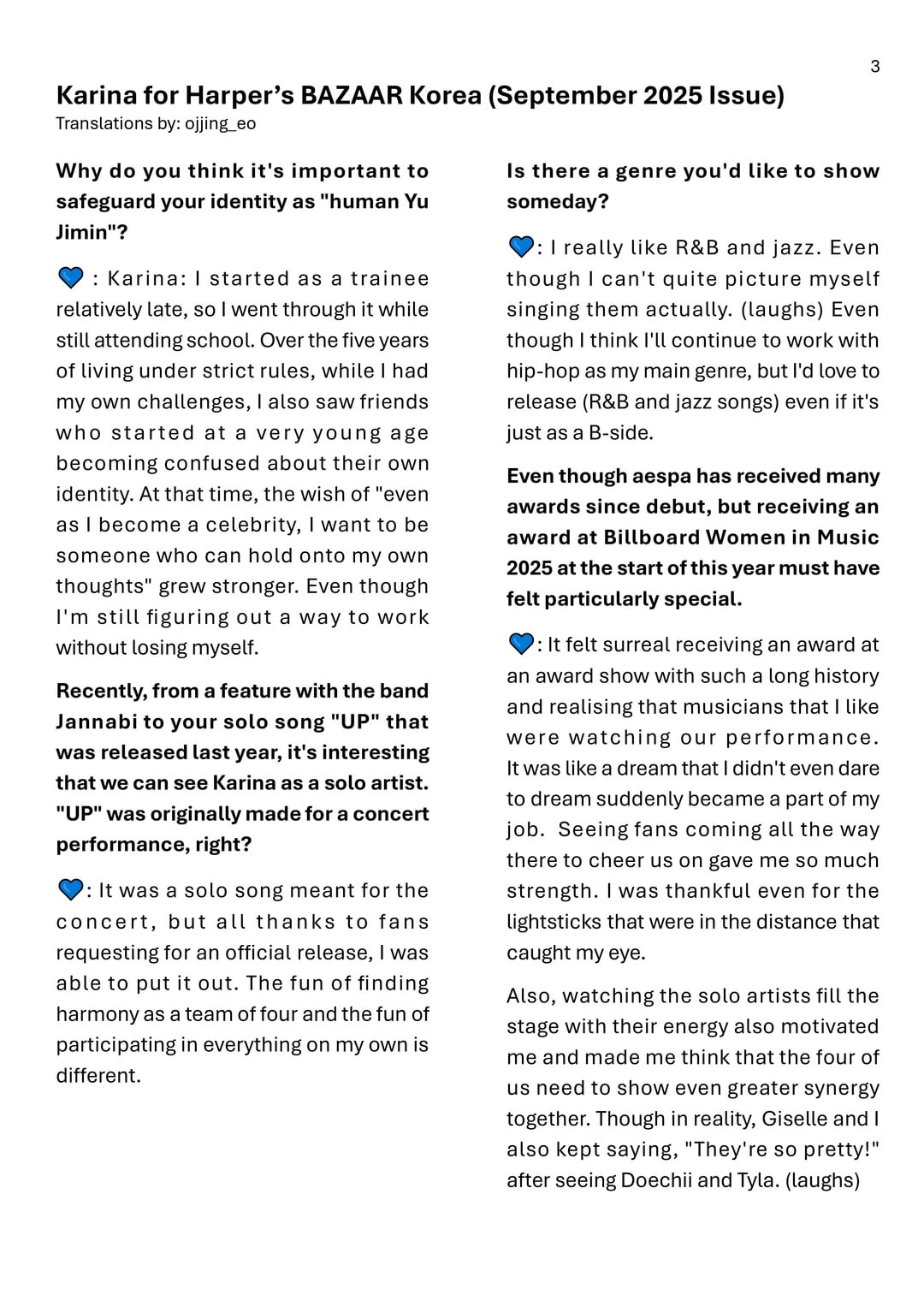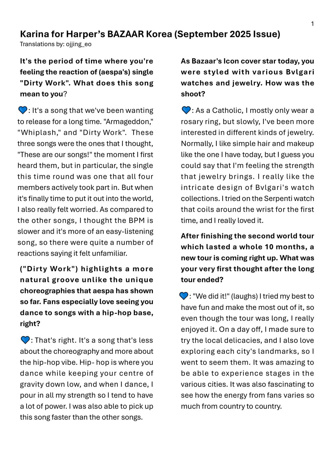[aespa] 250819 كارينا لكوريا هاربر بازار كوريا (سبتمبر 2025 مقابلة)