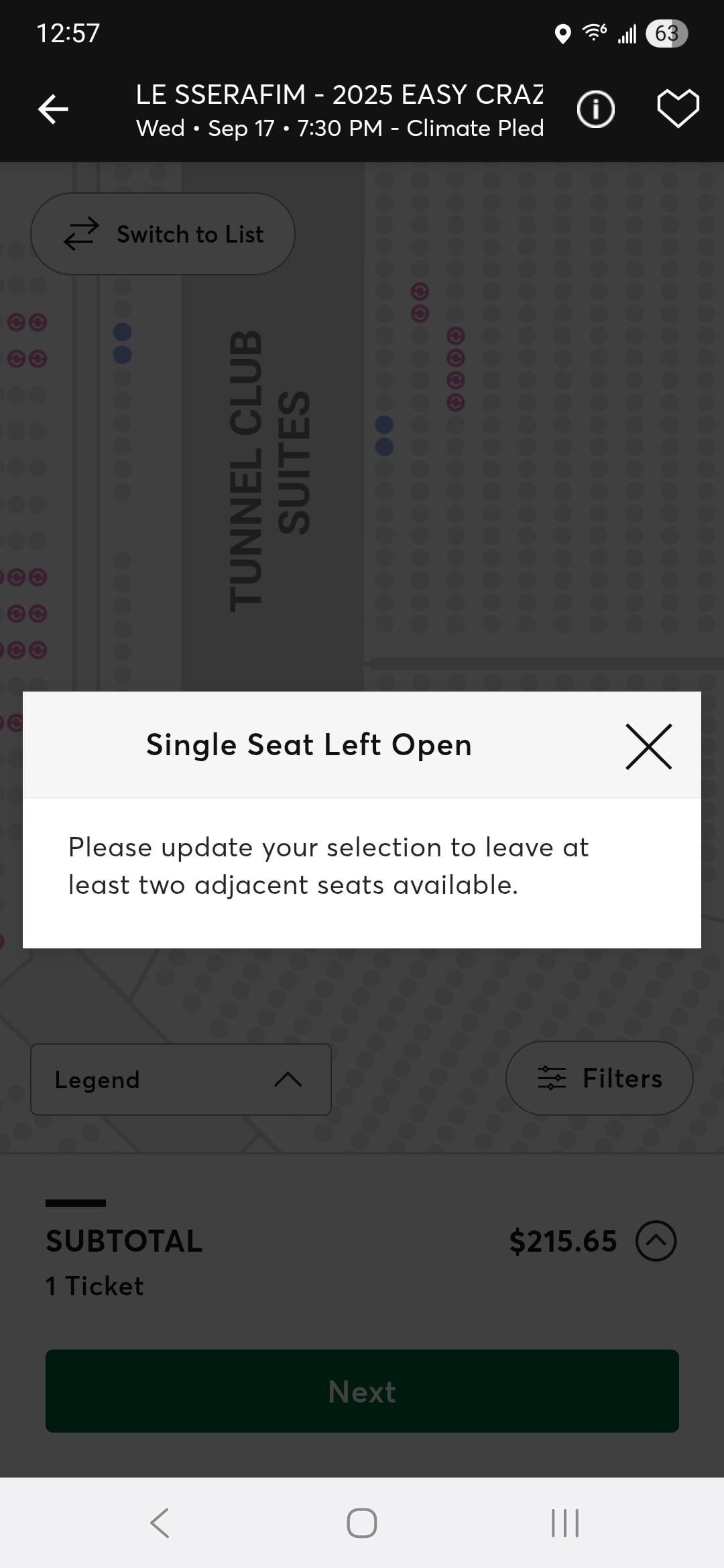 جميع الخيارات الرخيصة المتبقية هي مجرد أزواج من المقاعد التي لن تسمح لي Ticketmaster بالحجز. الذي اعتقد أن هذه كانت فكرة جيدة .. LE SSERAFIM LE SSERAFIM