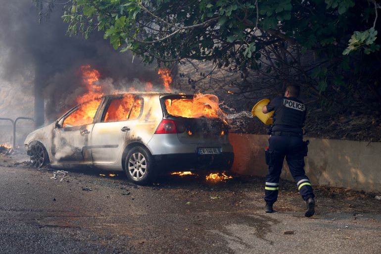 شرطي يحاول إطفاء سيارة اشتعلت فيها النيران خلال حرائق الغابات في مارسيليا (الفرنسية)قاتل صامت
