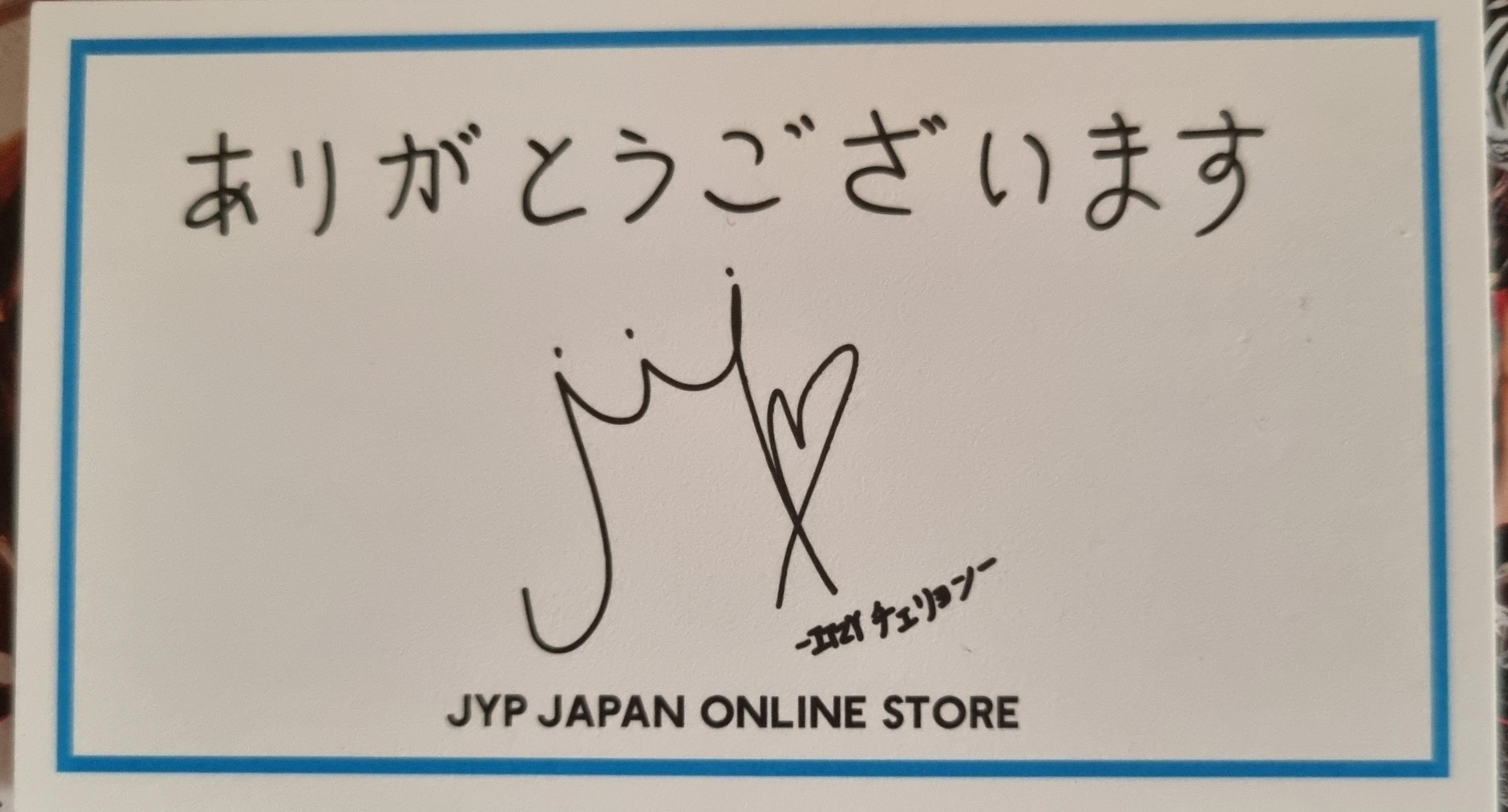 لقد حصلت للتو على ألبوم العدو الخاص بي ولديه بطاقة زيارة JYP مع بعض الكتابة اليابانية. هل هذا الابن تشايونج يشكرني؟