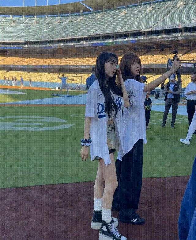 250910 تحديث Angela Wu Instagram مع Miyawaki Sakura و Hong Eunchae على ملعب Dodgers Stadium LE SSERAFIM LE SSERAFIM