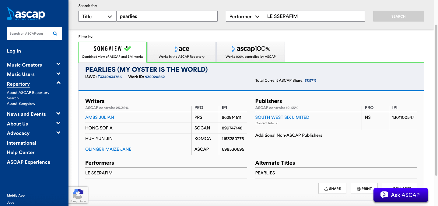 250913 تم تسجيل أغنية تسمى “Pearlies (My Oyster is the World)” بموجب Le Sserafim على ASCAP. هوه يونجين الفضل كأحد الكتاب. LE SSERAFIM LE SSERAFIM