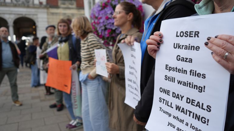 وخصّ محتجّون ترامب باستقبال خاص، إذ عرضوا صورا للرئيس ومرتكب الجرائم الجنسية جيفري إبستين على قلعة وندسور، حيث من المتوقع وصوله الأربعاء. كما تظاهر العشرات في البلدة الصغيرة غرب لندن.
