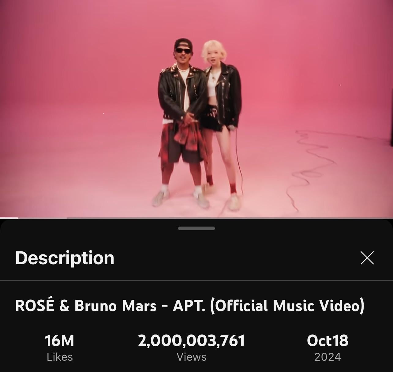 250917 APT. بقلم Rosé & Bruno Mars تصل إلى ملياري مشاهدة على YouTube
