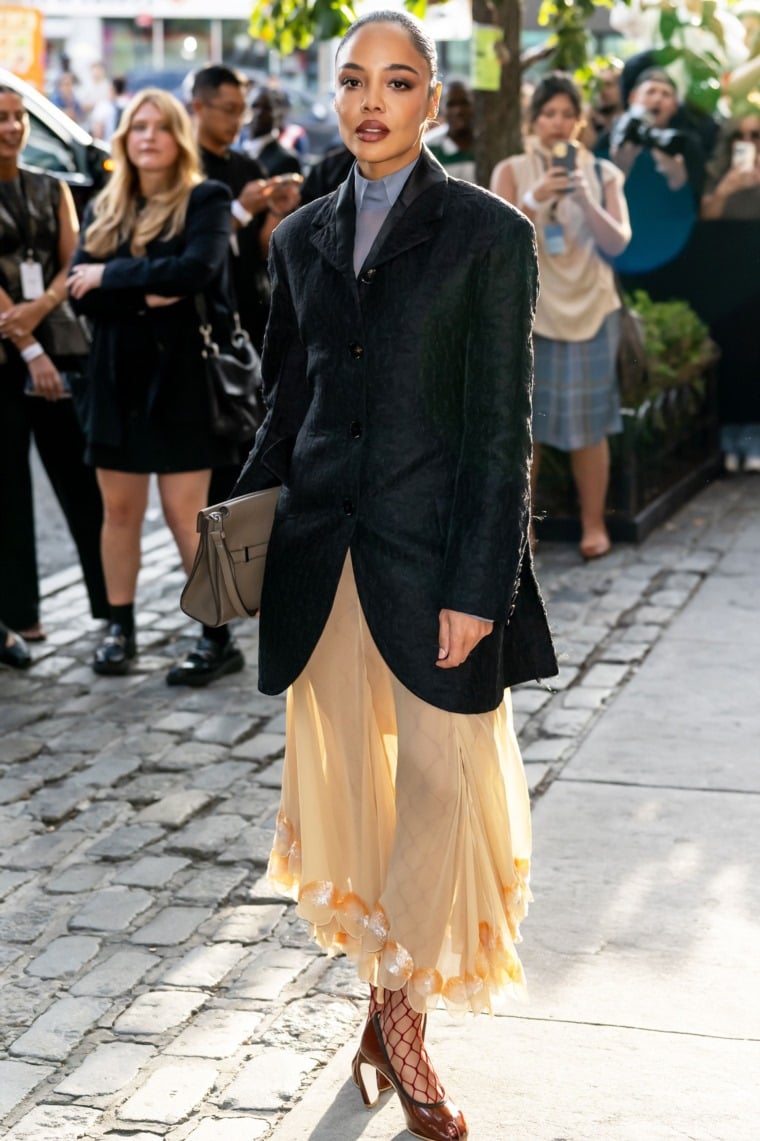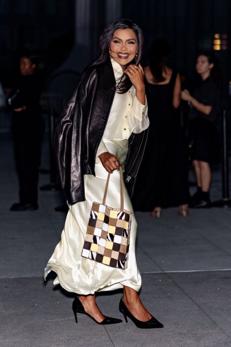 ارتدت قميصاً شفافاً باللون الكريمي فوق فستان ساتان، مع سترة جلدية وحقيبة توت مطرزة، وحذاء أسود كلاسيكي.