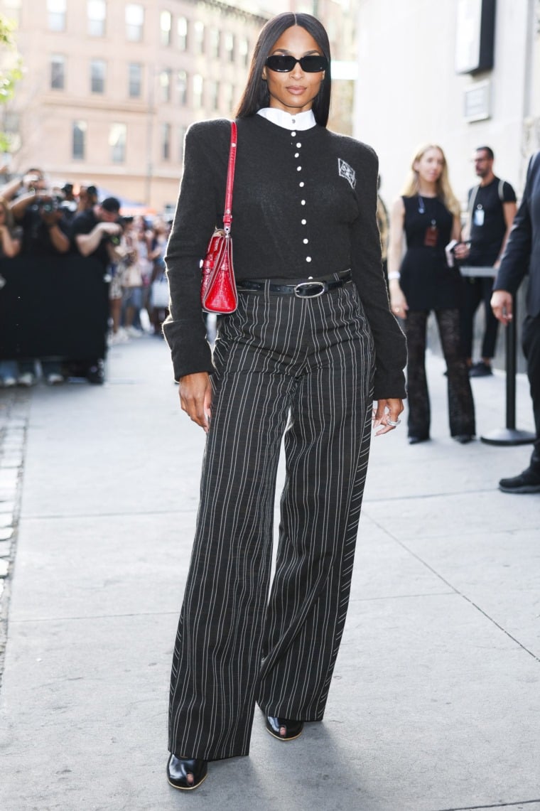 ظهرت بكنزة سوداء طويلة الأكمام، وسروال مخطط، وحقيبة كتف حمراء، مع حذاء ذو مقدمة مشقوقة.