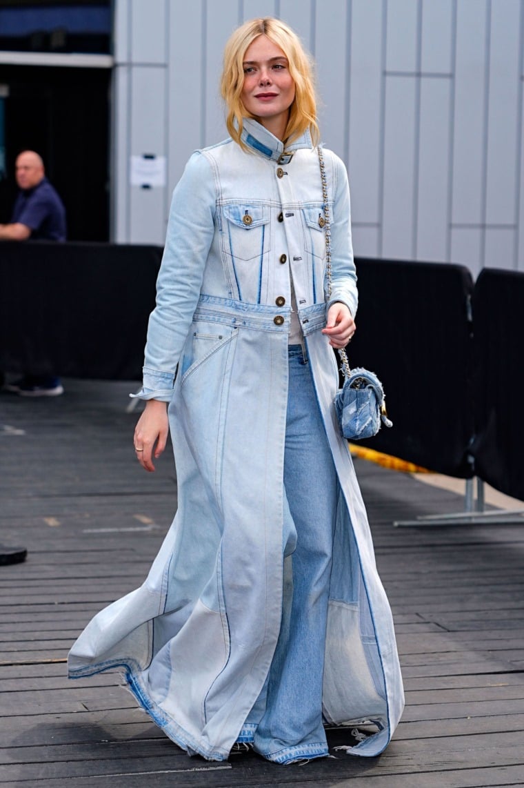 حضرت عرض Coach بجاكيت دنيم طويل وبنطلون واسع، مع حقيبة Coach Tabby بنسخة الدنيم.