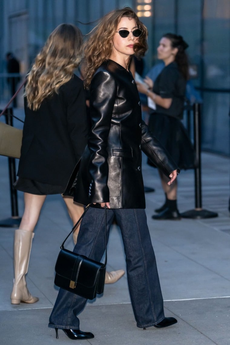 ارتدت سترة جلدية سوداء مع بنطلون واسع مستقيم، وحذاء جلد أسود، وحقيبة على شكل ساتشيل.
