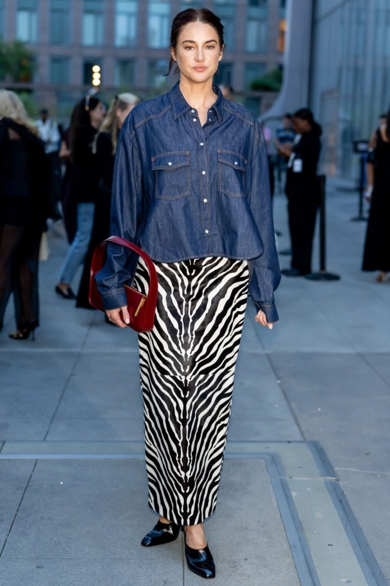 ارتدت قميص دنيم قابل للزر مع تنورة ماكسي بنقوش الحمار الوحشي، مع حقيبة كتف خمريّة وحذاء أسود بكعب.
