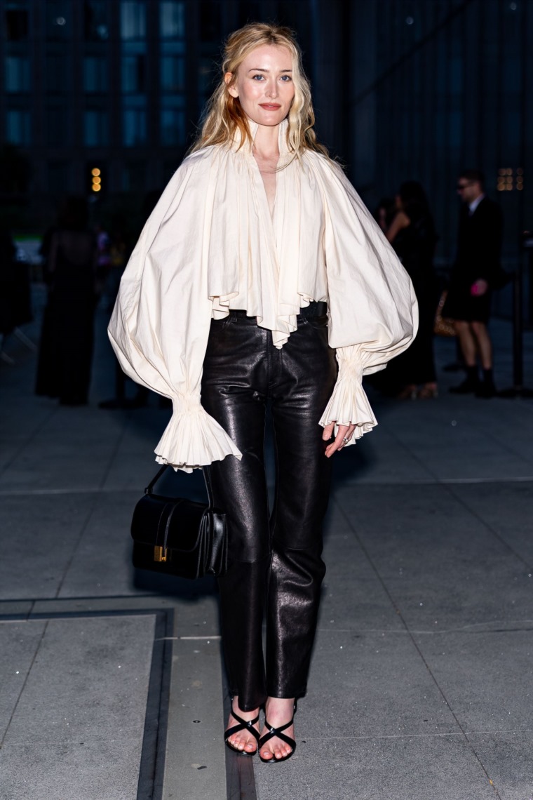 اختارت بلوزة باللون العاجي بأكمام منفوخة، مع سروال جلدي أسود وحذاء بكعب متقاطع.