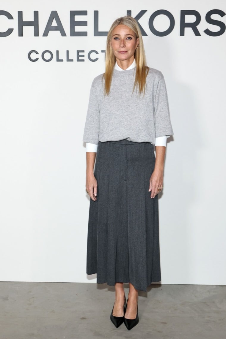ارتدت بلوزة رمادية وتنورة بليسيه، مع حذاء أسود كلاسيكي.