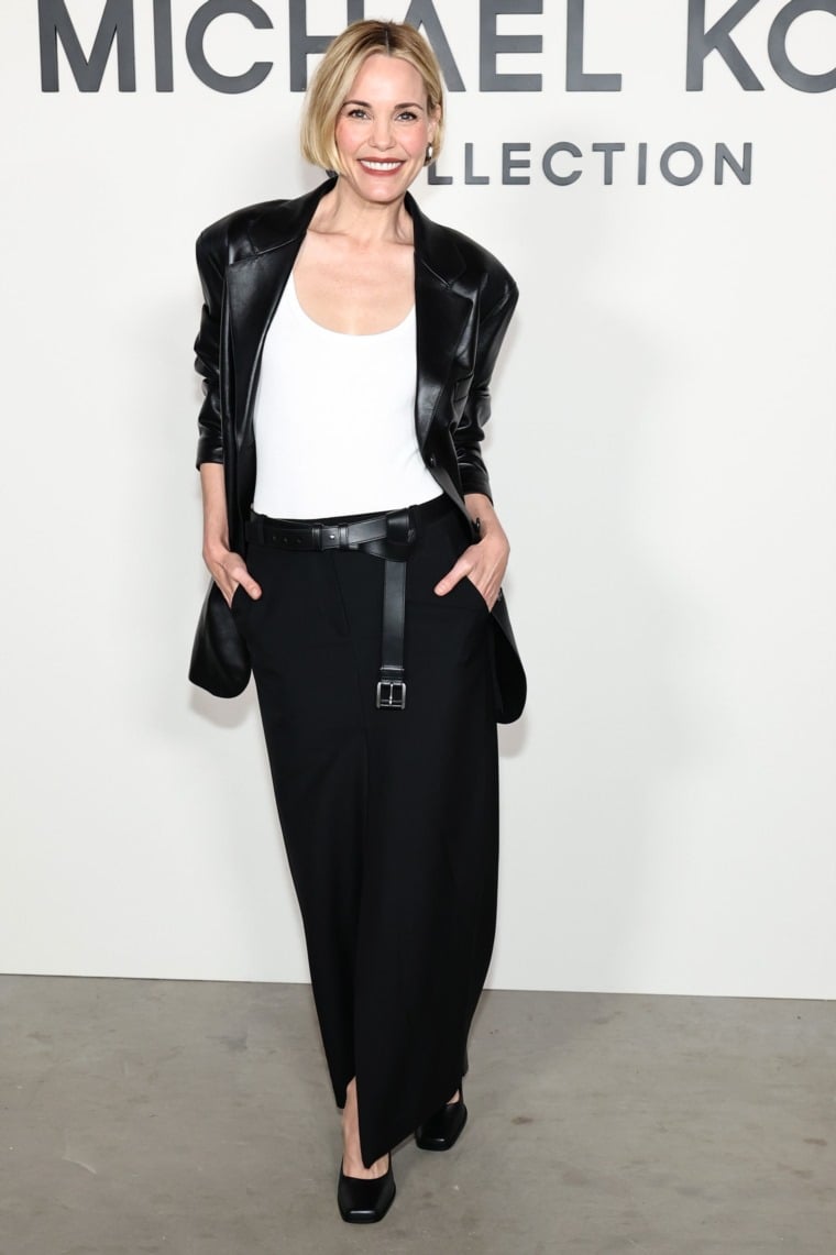 ظهرت ببلوزة بيضاء، مع سترة جلدية سوداء وتنورة طويلة وحذاء مربع المقدمة.