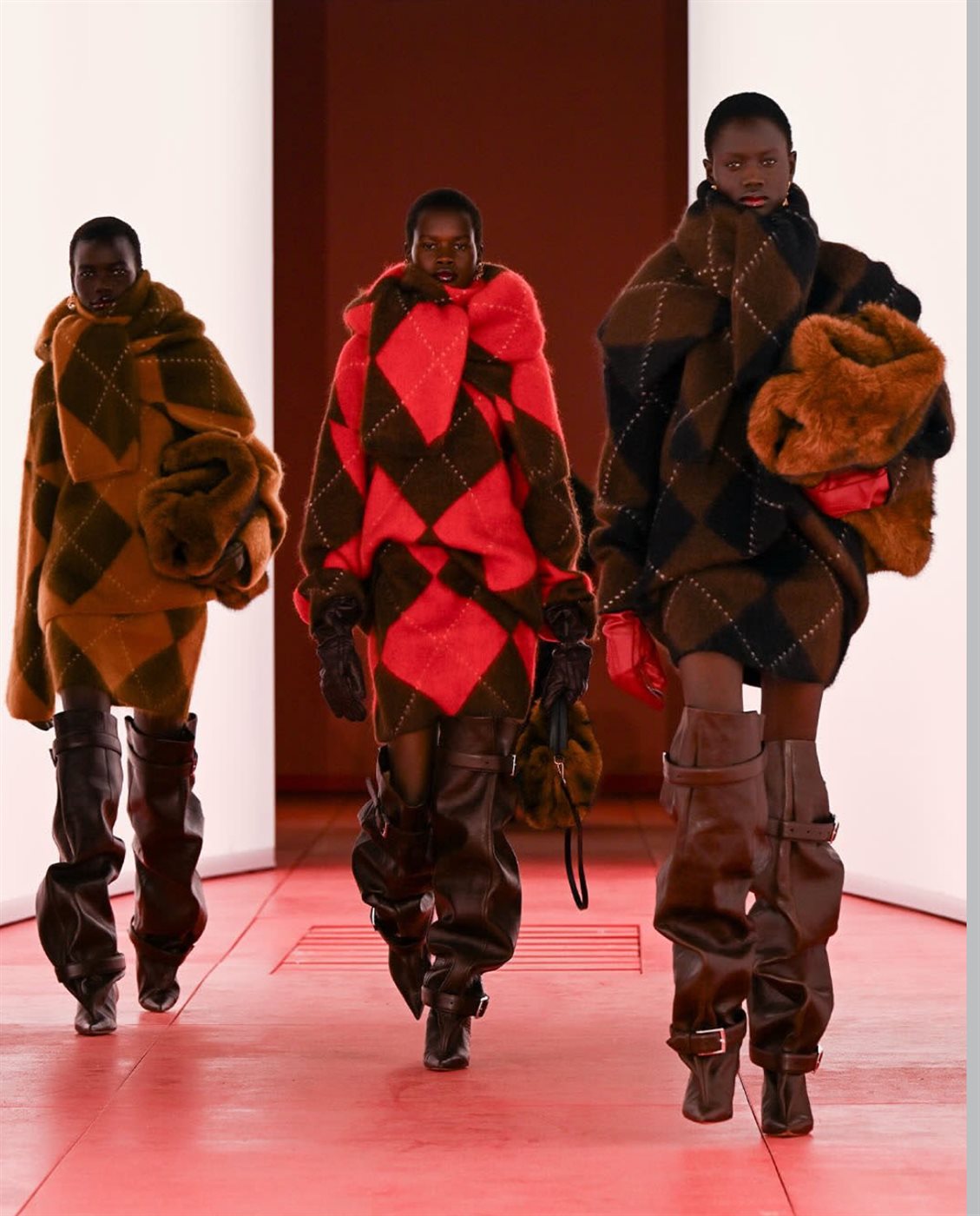افتتحت جاكي هوبر العرض بقوامها الجريء، بينما تألقت أميليا غراي بإطلالة جريئة بحذائها الطويل الذي يصل إلى الركبة وسترتها المصنوعة من جلد الغنم: “سيكون الشتاء جذابًا”.