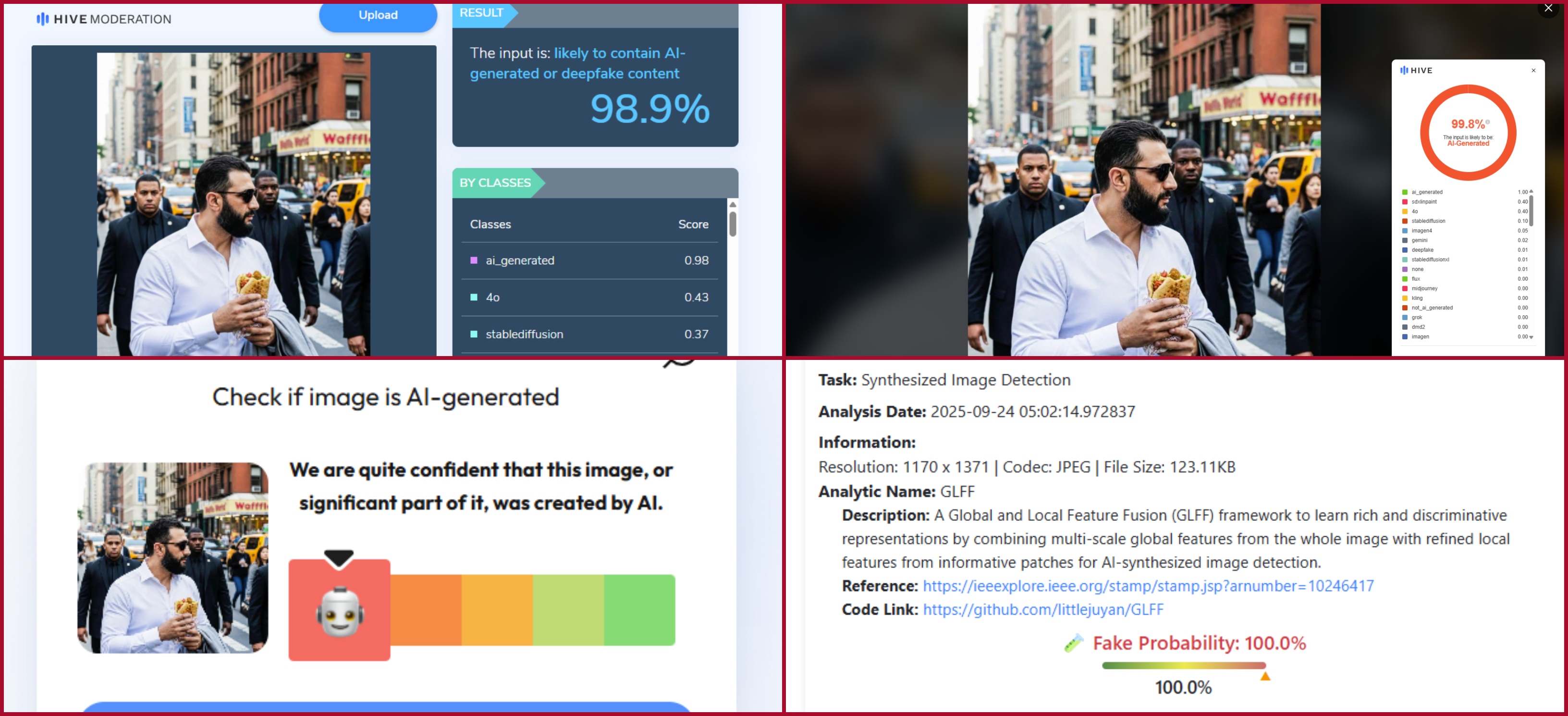وتدعم هذا الاستنتاج نتيجة فحص الصورة في مواقع متخصصة بكشف الصور الزائفة، مثل Hive Google وHive Moderation وSightengine وWas it AI… وايضا برنامج DeepFake-0-Meter الذي تؤمنه جامعة بافالو. وجاءت ان الصورة منشأة على الارجح بالذكاء الاصطناعي بنسبة عالية جدا وصلت الى 99.8%، وفقا لتحليل الموقعين الاولين، بينما توصلت أداة “اكتشاف الصور المركبة” في البرنامج الاخير الى ان نسبة التزييف هي 100%.