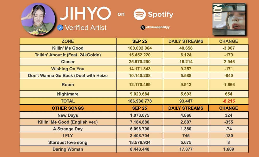 [TWICE] 250926 تحديث Twicespotifyy: “Killin ‘Me Good” تجاوز 100 مليون تيار على Spotify