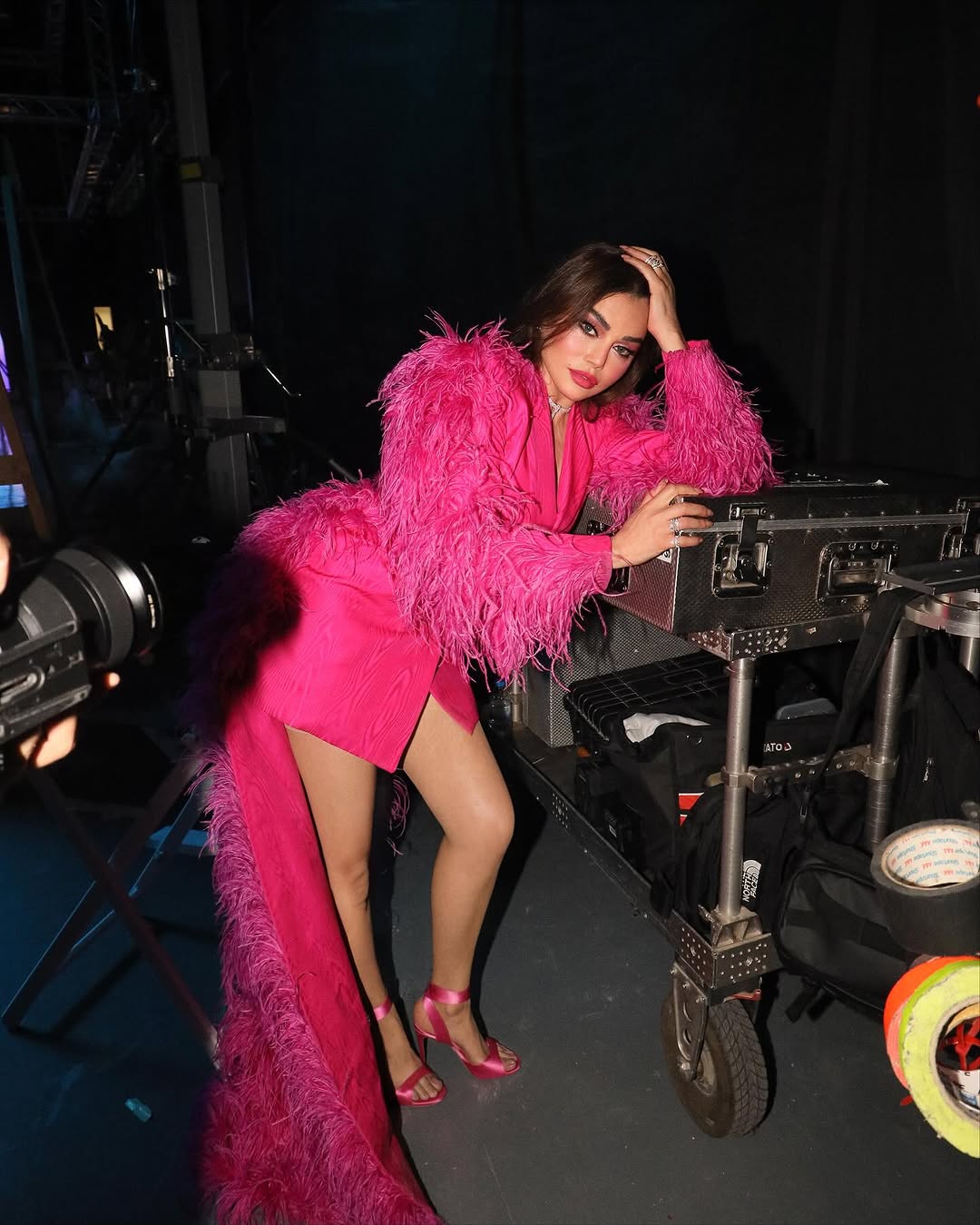 أما في الإطلالة الثانية، فظهرت هيفاء وهبي بفستان بليزر قصير من قماش التفتا الفوشيا، جاء بتصميم جريء ينسدل منه كاب خلفي طويل مزيّن بالريش ليمنحها حضوراً استثنائياً.