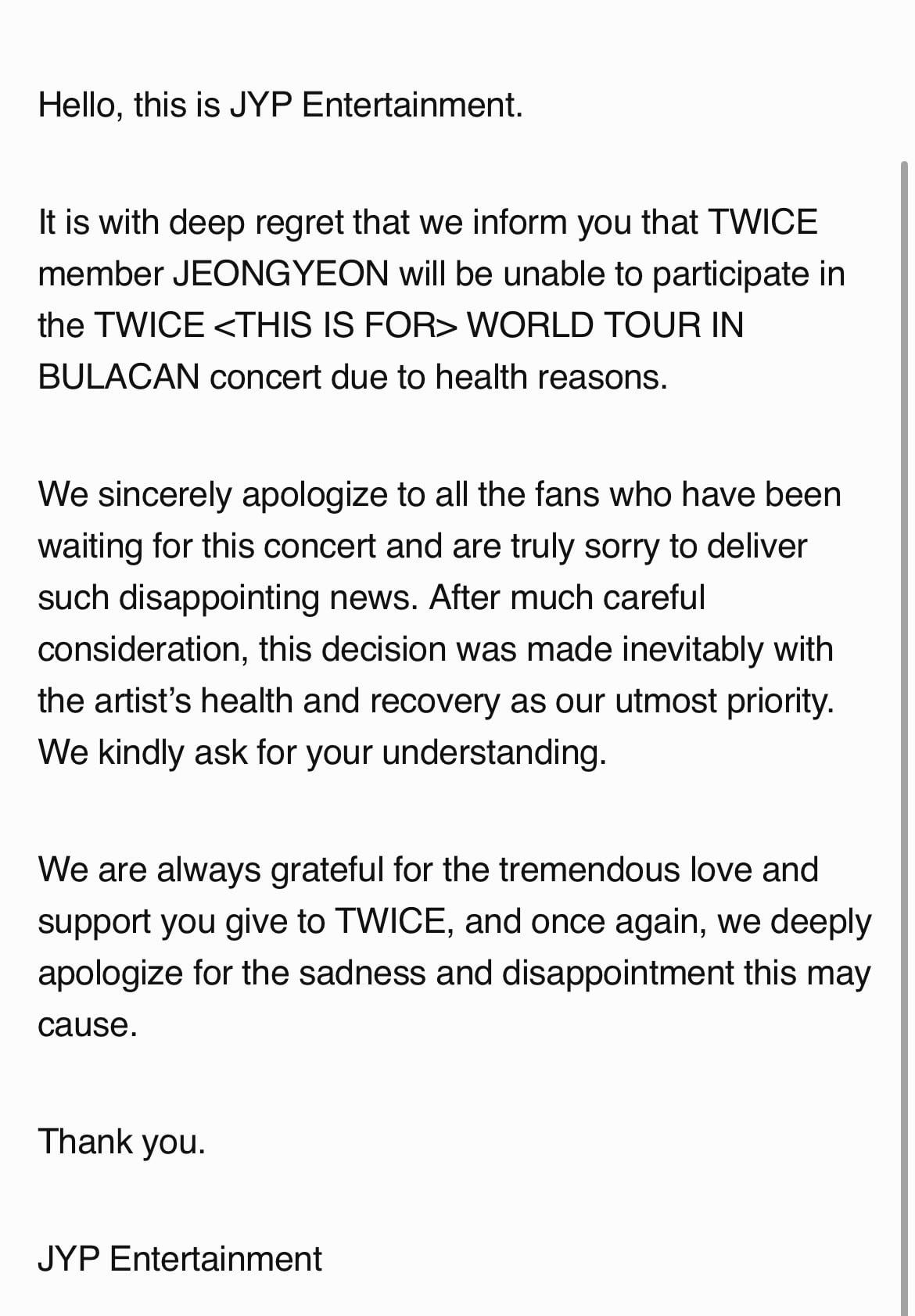 الرئيسية»K-POP»TWICE»[TWICE] 251002 تحديث مرتين من المعجبين – Jeongyeon لتغيب عن مرتين World Tour في بولاكان