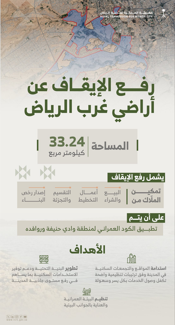 أعلنت الهيئة الملكية لمدينة الرياض، رفع الإيقاف عن أراضٍ واقعة في غرب مدينة الرياض، بمساحة إجمالية تبلغ 33.24كم².