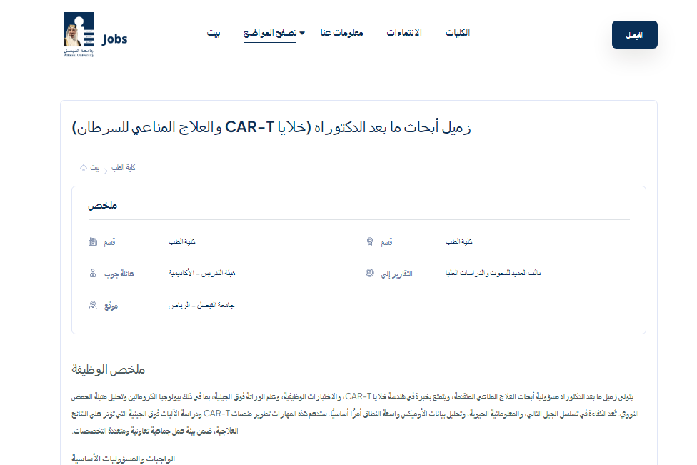 وظيفة جامعة .. أعلنت جامعة الفيصل بالعاصمة الرياض عن توفر وظيفة زميل أبحاث ما بعد الدكتوراه في مجال العلاج المناعي للسرطان، مع تركيز خاص على أبحاث خلايا CAR-T والهندسة الوراثية المتقدمة.