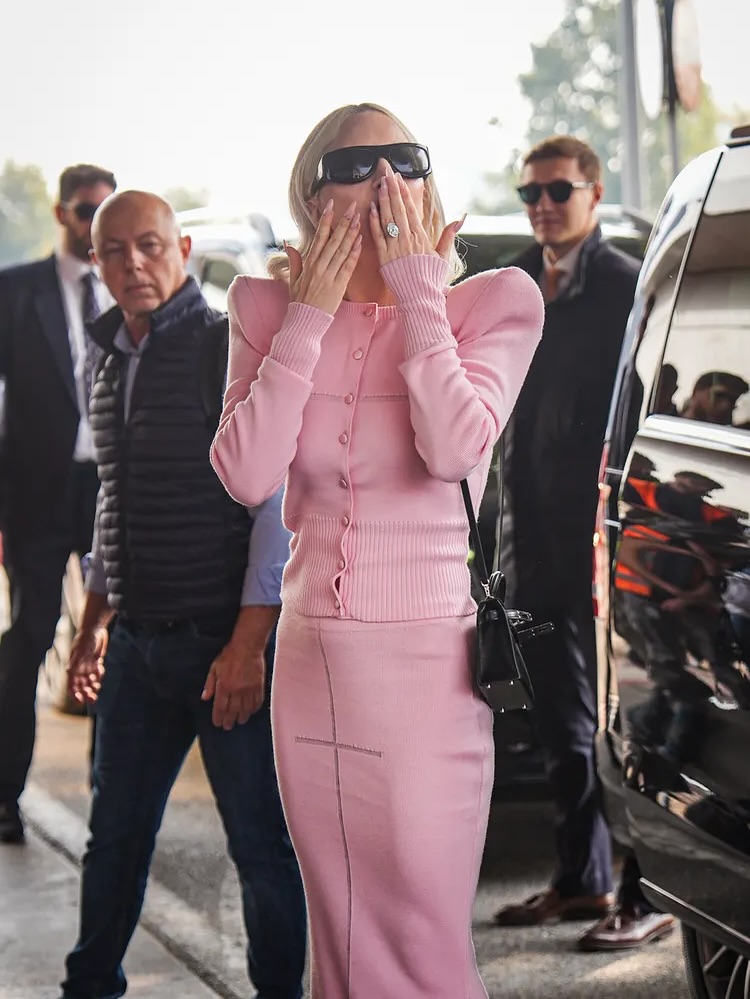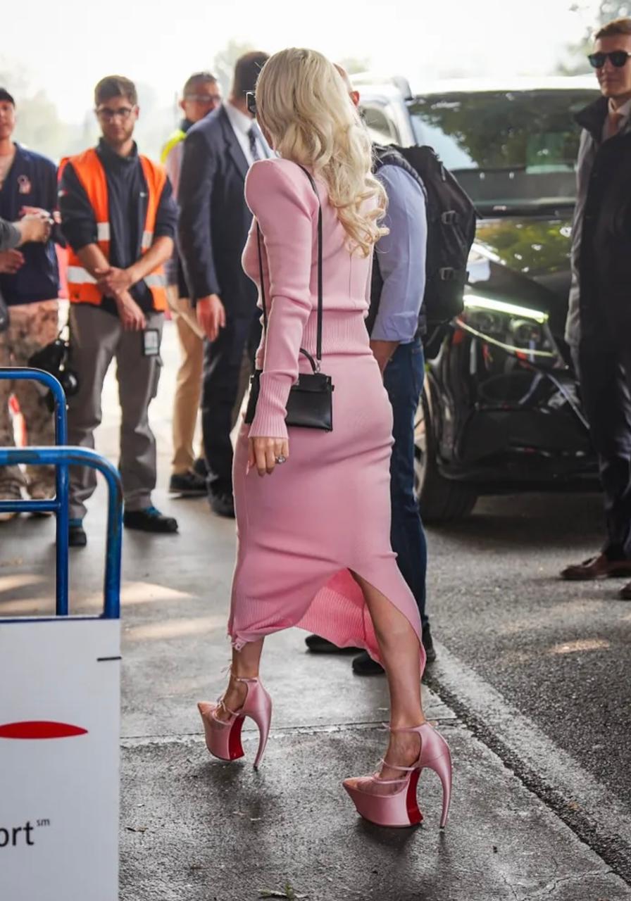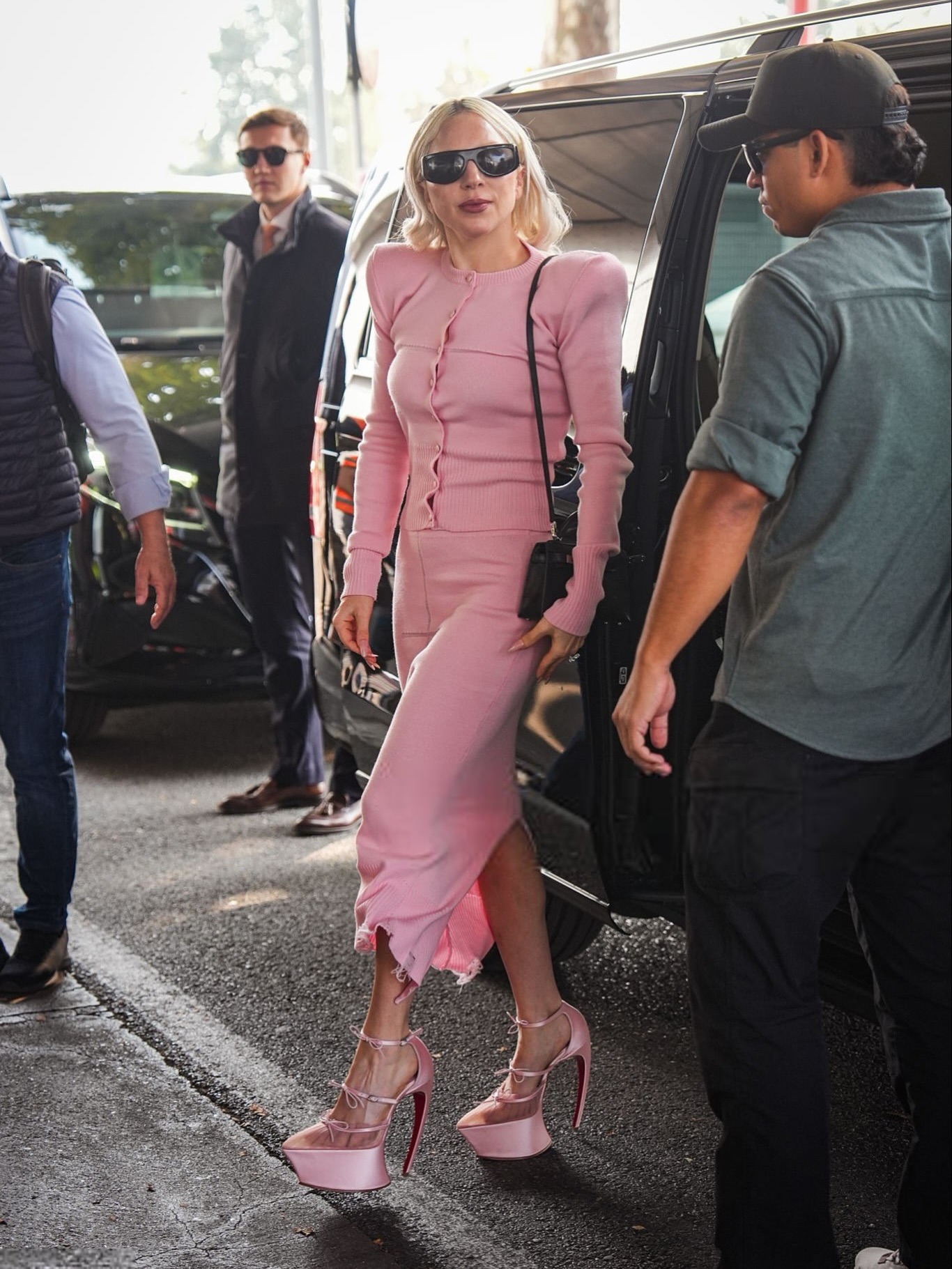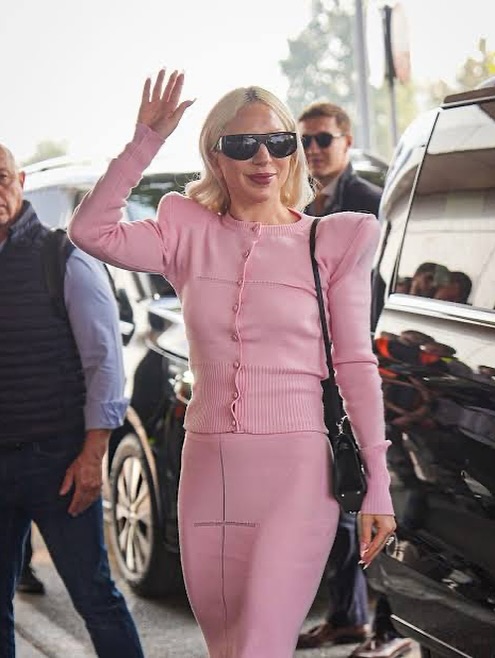ابتعدت ليدي غاغا عن اللون الأسود المألوف في إطلالاتها الدراميّة، واختارت التأنّق بلون الباستيل الوردي في ميلانو، معتمدة تصميماً راقياً من الصوف الناعم بالنمط المحبوك (Vendome Knit Set) من علامة Matières Fecales. إطلالتها العصريّة الراقية، شملت تنّورة طويلة تلامس كاحل القدم، ذات قصّة تعانق الساقين، ثم تتسّع قليلاً من الأسفل، مع شقّ صغيرٍ من الخلف. وقد برزت على طول التنّورة تخريمات ناعمة متقاطعة. أما الـ “توب” فجاءت بكُمّين طويلين مع بروز للكتفين، بتفصيل أزرار صغيرة، وخط أفقي من التخريمات الناعمة عند أعلى الصدر. كذلك، انتعلت نجمة فيلم Joker: Folie À Deux كندرة ذات تصميم مبتكر، وتكامل لونيّ مع زيّها Hannah Shoes، من Matières Fecales x Christian Louboutin، وقد تميّزت بمنصّة ضخمة وكعبٍ رفيعٍ شاهق.