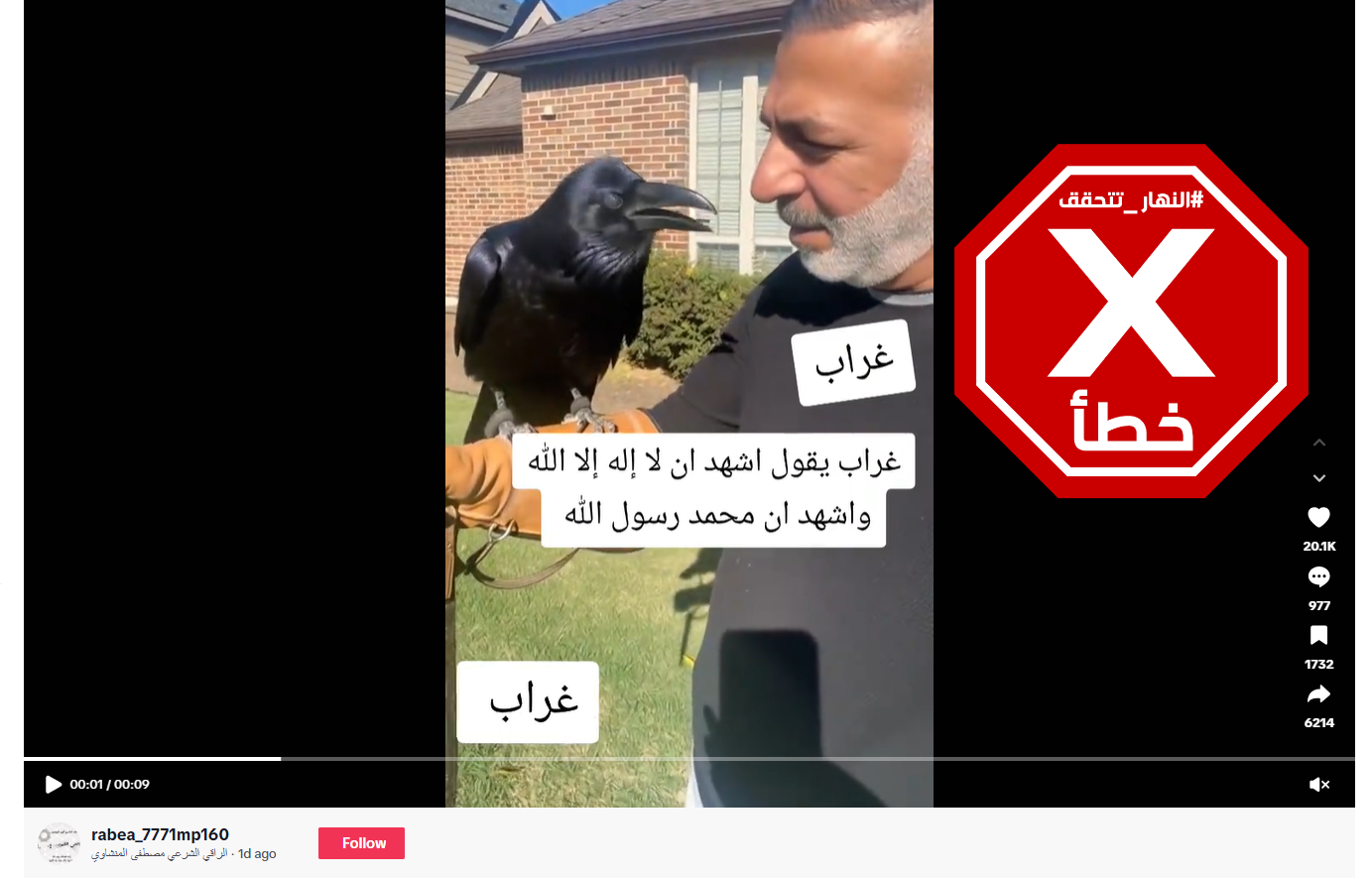 تقييمنا النهائي: اذاً، ليس صحيحاً ان “غرابا نطق بالفعل بالشهادتين” وفقاً لما يشاهد في الفيديو. في الواقع، هذه المشاهد ليست حقيقية، لكونها منشأة بالذكاء الاصطناعي. ونشرها بهذا الوصف حساب alkateb429@ في تيك توك، في 13 تشرين الاول 2025.