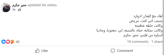 وعلق منير مكرم قائلًا: “لقائي مع الفنان إدوارد .. بسبب أني كنت مريض .. وكانت حلقة عظيمة .. وكانت بمثابة حياة بالنسبة لي معنويًا وماديًا .. اشكره من قلبي”.