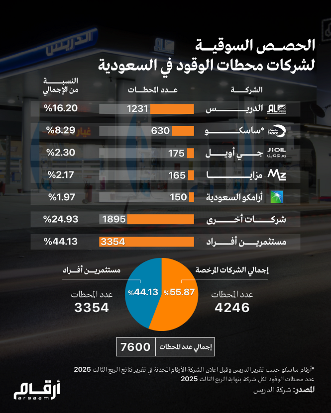 وحسب التقرير يبلغ عدد محطات الوقود بالسعودية نحو 7600 محطة، تتصدر الدريس بـ 1231 محطة بنهاية سبتمبر 2025، فيما بلغ عدد محطات ساسكو 630 محطة.