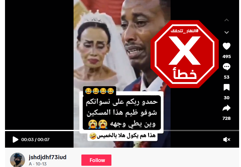 تقييمنا النهائي: اذاً، ليس صحيحاً ان “عريسا بكى في يوم زفافه” كما يُشاهد في الفيديو المتناقل. في الواقع، هذه المشاهد ليست حقيقية، لكونها مولدة بالذكاء الاصطناعي. ونشرها بهذا الوصف حساب king__mohan.10@ في تيك توك، في 18 تموز 2025.