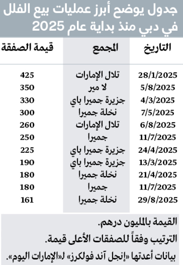 وأضاف أن عام 2025 تجاوز هذه الأرقام القياسية، وسجلت الإمارة أربع صفقات جاوزت حاجز 300 مليون درهم، لافتاً إلى أن من أبرز الصفقات بيع فيلا شاطئية في جزيرة «جميرا باي» بقيمة 330 مليون درهم، إلى جانب صفقة بيع فيلا قصر الرخام في «تلال الإمارات» بقيمة 425 مليون درهم، وهي الأعلى حتى اليوم.