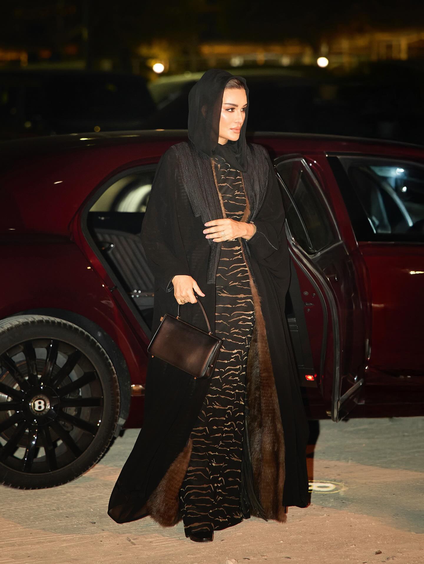 ومن الإطلالات الراقية التي تحاكي صيحات الموضة، ارتدت الشيخة موزا فستاناً بنمط جلد النمر باللونين الأسود والبيج الداكن، قرنته مع عباءة سوداء مطرّزة يدوياً عند أعلى الصدر، ومبطنة بالفرو البنيّ الفاتح. ونسّقت إطلالتها مع جزمة من الجلد الأسود وحقيبة يد من اللون نفسه.