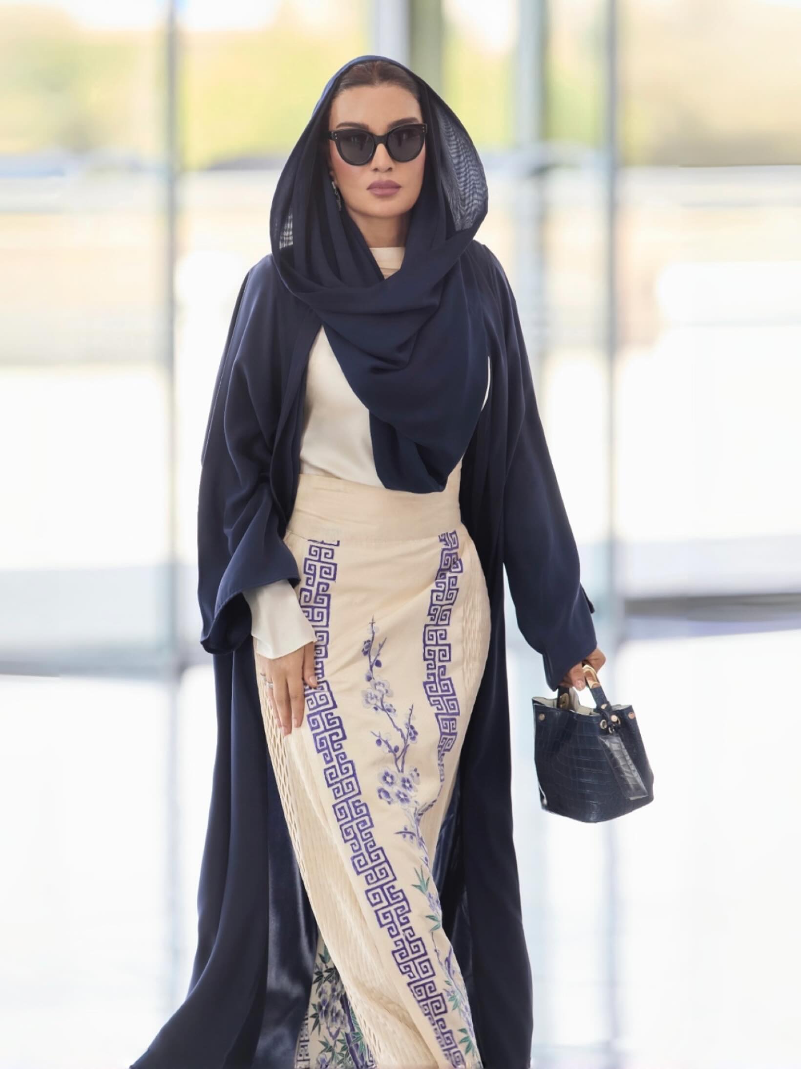 سادت هذا العام موضة زخارف الأزهار التي تعكس النمط الرومانسي-الأنثوي، وقد اختارت الشيخة موزا التأنّق بهذه الصيحة بأسلوب خاص بها، حيث ارتدت زيّاً تقليدياً مستوحى من النمط الآسيوي بتطريزات أزهار البرقوق والزخارف الهندسيّة التي تزيّن الفستان الأبيض العاجي. وأكملت إطلالتها الراقية مع عباءة باللون الأزرق الداكن من تصميم سناء الحدّاد لعلامة (Jabador)، وحقيبة يد فاخرة (Diorific Bucket Bag in Marine من “ديور” (Dior) باللون الكحليّ.