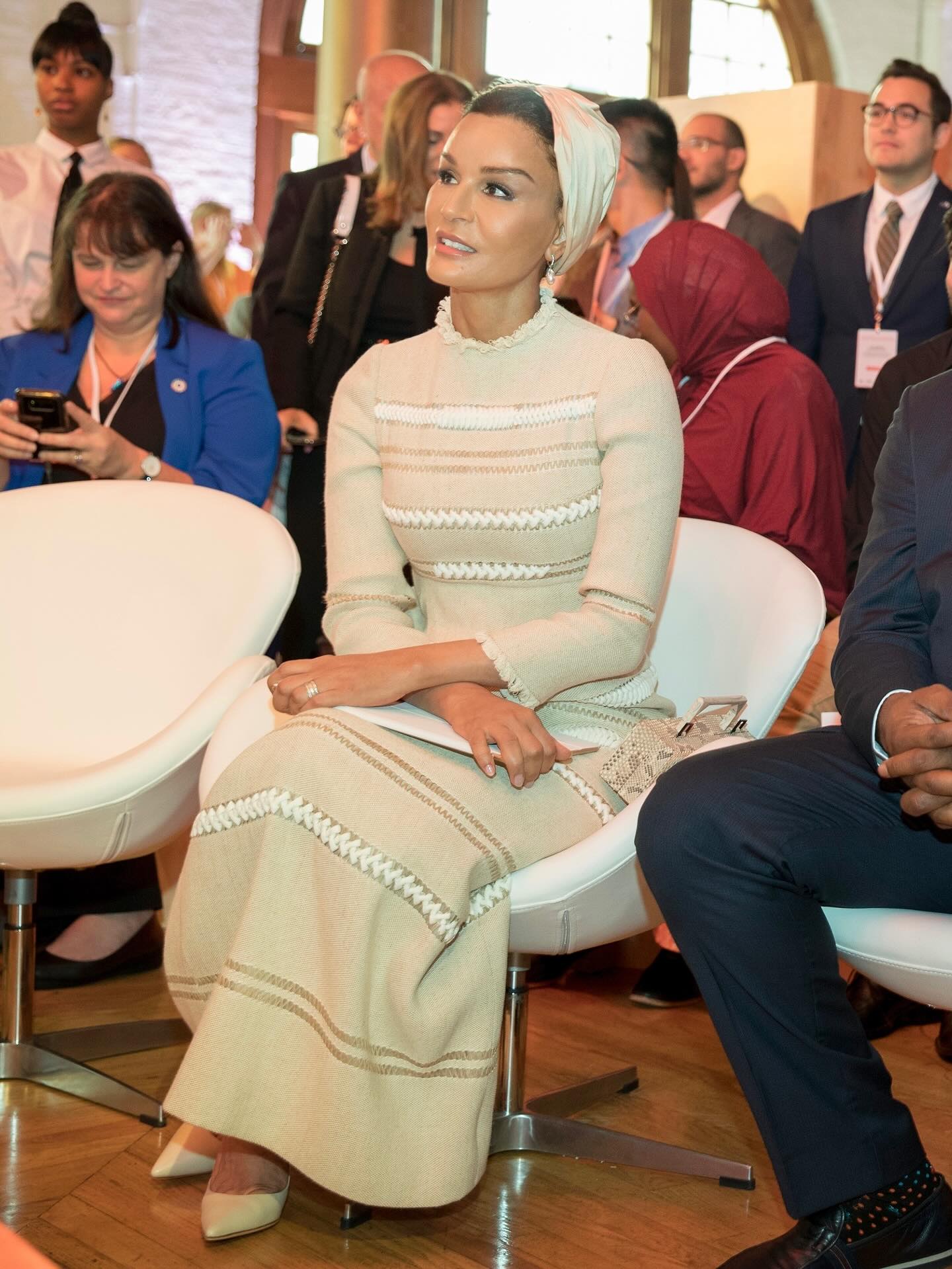 في إطلالة مختلفة، ارتدت الشيخة موزا فستاناً طويلاً باللون العاجيّ بتفاصيل محبوكة باللونين البيج والأبيض، وكشكش رفيع يؤطّر الياقة وأطراف الكُمّين الطويلين من تصميم (Christophe Josse)، وأكملت إطلالتها بكندرة كلاسيكيّة مدبّبة من الجلد بلون الفستان.