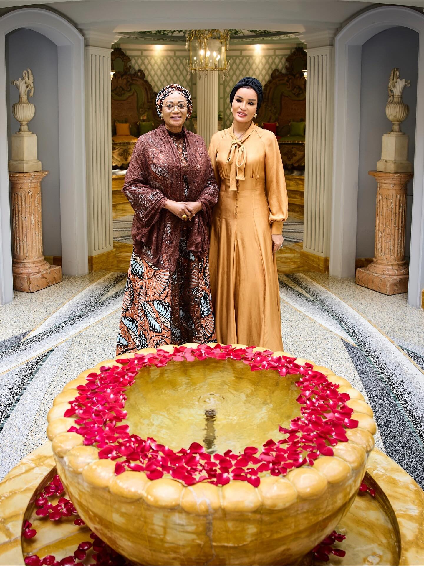 عند لقائها بالسيدة الأولى النيجيريّة، اختارت الشيخة موزا نمط المونوكروم بفستانٍ من الحرير بلون عسليّ، صُمّم خصّيصاً لها بهذا اللون من المصمّم الإسباني “خوان فيدال” (Juan Vidal) الذي كان قد ابتكر النسخة الأولى من التصميم نفسه عام 2023 باللون الأزرق المطبّع بالأزهار. تميّز الفستان بقصّة منسدلة مع كُمّين طويلين منفوخين قليلاً وبتفصيل ربطة معقودة حول العنق، وأزرار صغيرة. كذلك انتعلت صندلاً مطبّعاً بنمط جلد الفهد.