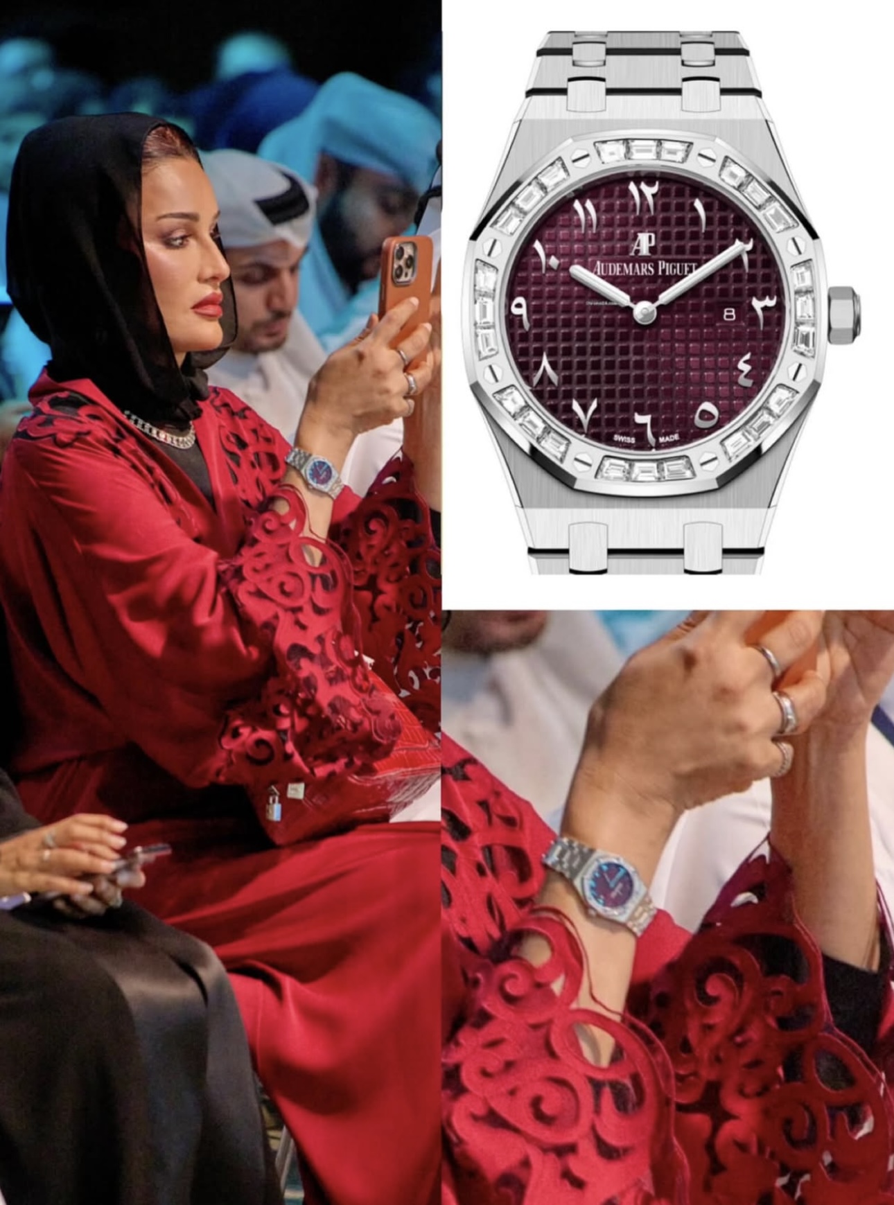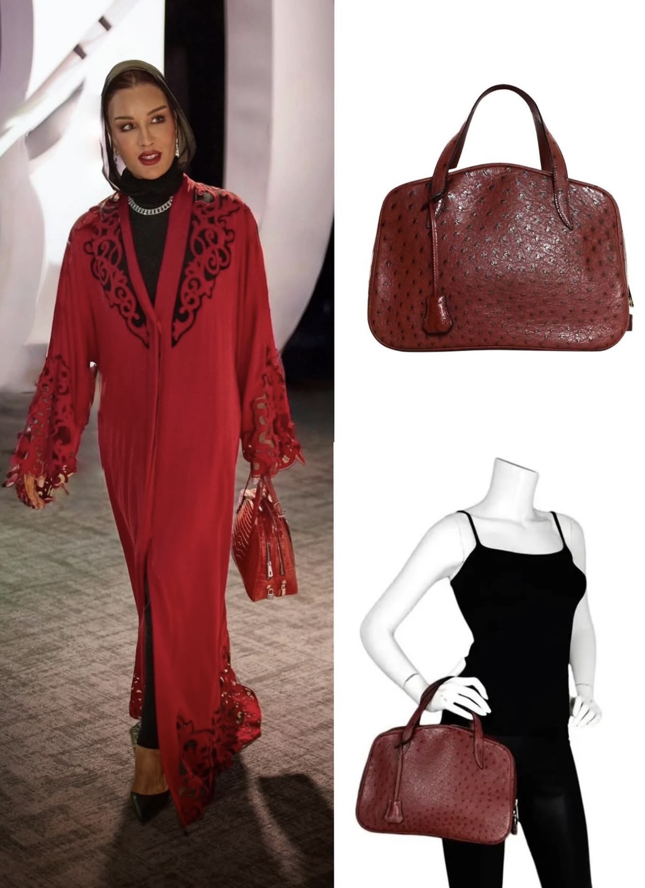 حضرت الشيخة موزا منتدى خرّيجي مؤسسة قطر السنويّ 2025، متأنّقة بفستان أسود طويل ذي ياقة عالية، نسّقته مع عباءة حمراء داكنة مخرّمة بتقنيّة الليزر، صُمّمت خصيصاً لها من “دولتشي أند غابانا” (Dolce & Gabbana). وأكملت الشيخة إطلالتها الراقية بحقيبة يد محدودة الإصدار من “هيرمس” (Hermès) مصنوعة من جلد النعام وتحمل اسم “الدوحة” (Limited Edition Maroon Ostrich Doha Bag) وهي حقيبة فاخرة مصمّمة بإلهام من الشيخة موزا. كذلك، انتعلت الشيخة، كندرة مدبّبة من الجلد الأسود، وزيّنت معصم يدها بساعة فاخرة من محدودة الإصدار باسم “قطر” (Royal Oak Qatar Edition Watch) من “أوديمار بيغيه” (Audemars Piguet).