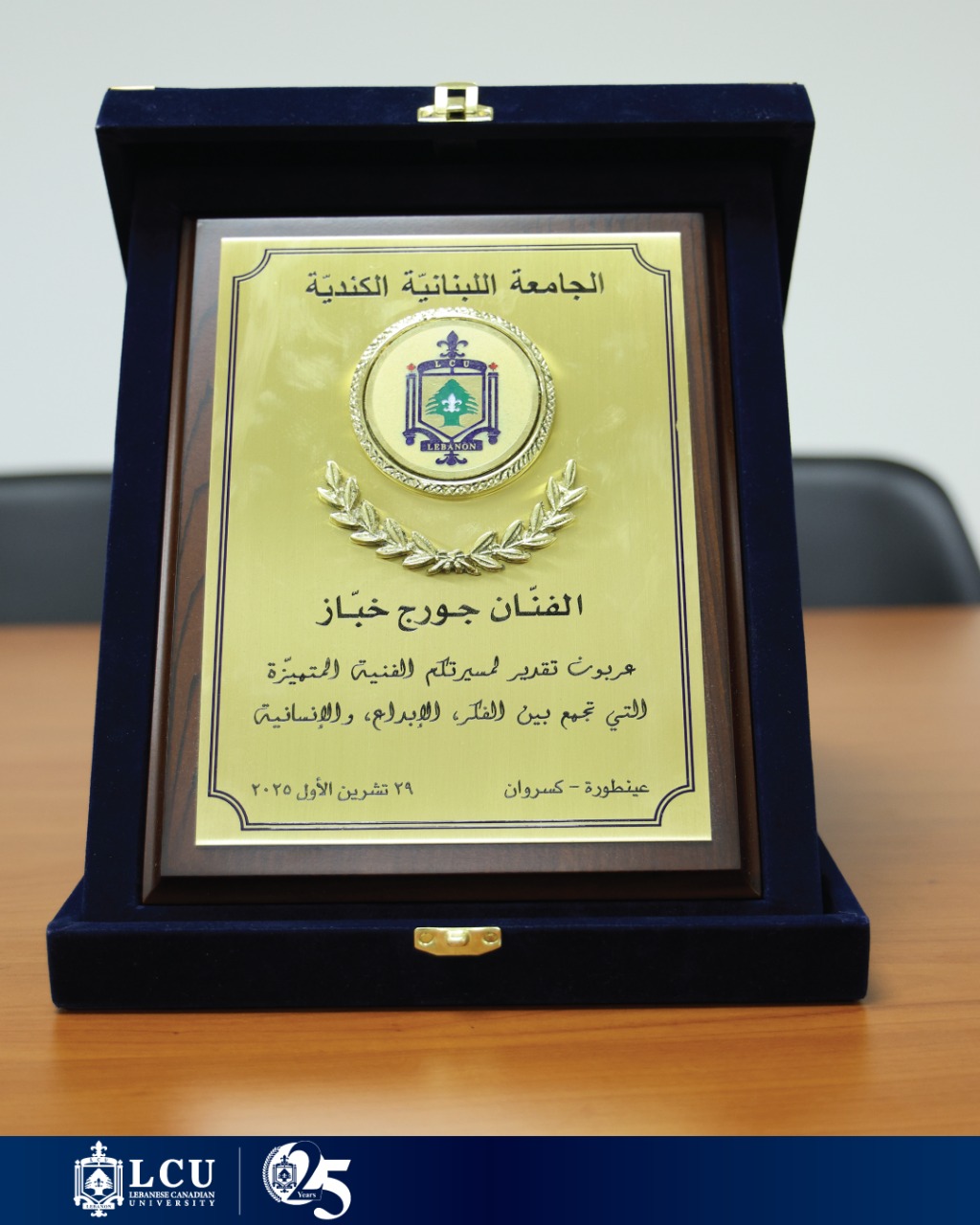 وفي ختام اللقاء، قدّمت الجامعة، بشخص رئيسها البروفسور د. جلال حلواني، والمؤسس د. روني أبي نخله، والمديرة السيدة رانيا حبيب، درعًا تكريمية للفنان جورج خبّاز عربون تقدير لمسيرته اللامعة وإسهاماته في ترسيخ صورة الفن الهادف وصون القيم الثقافية والإنسانية في لبنان والعالم العربي.
