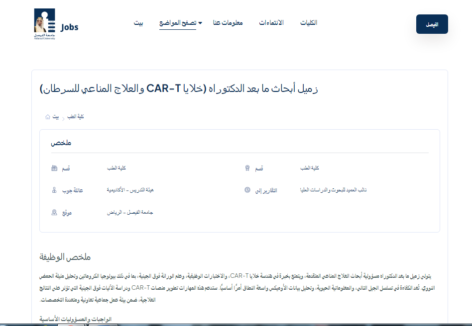 وظيفة جامعة.. في إطار سعيها لتعزيز التميز في البحث العلمي والابتكار الطبي، أعلنت جامعة الفيصل بالعاصمة السعودية الرياض عن فتح باب التقديم لشغل وظيفة زميل أبحاث ما بعد الدكتوراه بكلية الطب، في مجال العلاج المناعي للسرطان مع تركيز خاص على أبحاث خلايا CAR-T وهندستها الجينية.