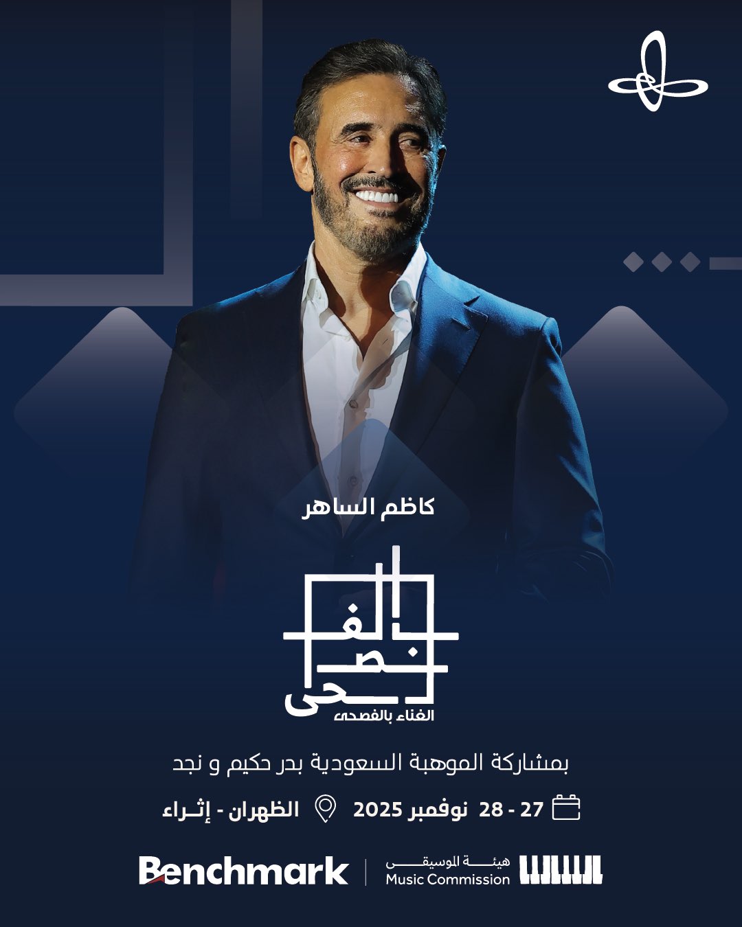 في ليلتَين استثنائيّتَين تُعيدان سحر اللغة العربيّة إلى المسرح، يلتقي الفنّان العراقيّ كاظم السّاهر جمهوره في السّابع والعشرين والثّامن والعشرين من نوفمبر ضمن فعاليّة “الغناء بالفصحى” الّتي تنظّمها شركة بنشمارك بالتّعاون مع هيئة الموسيقى، وذلك على مسرح إثراء “الظهران”.