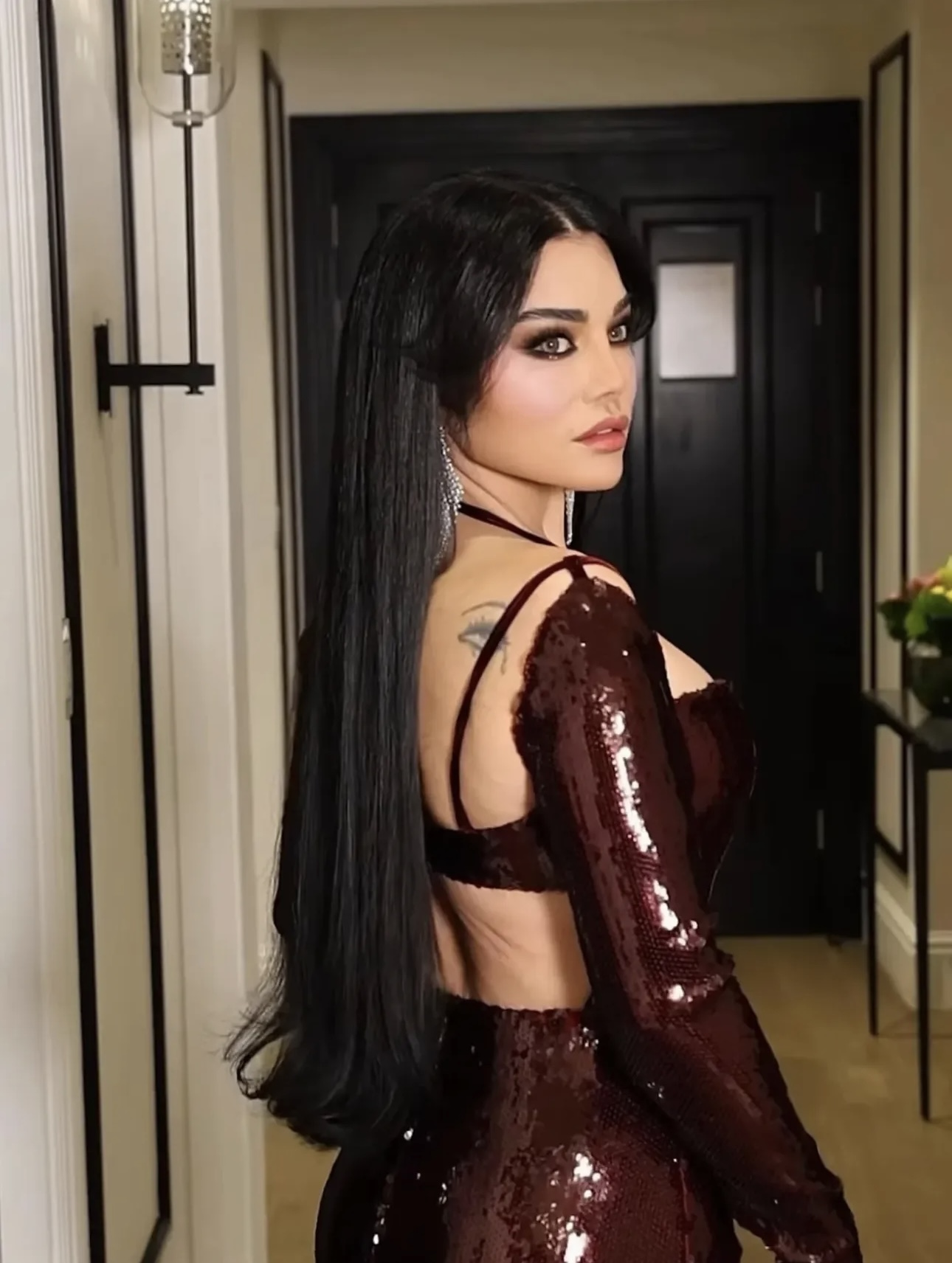 تألّقت هيفاء وهبي بفستانٍ باللون البرغندي مطرّز بالكامل بالترتر البرّاق، صمّمه خصّيصاً لها المبدعرامي سلمون بقصّة طويلة تعانق جسمها، تميّزت بياقة تكشف الكتفين وأعلى الصدر. جاء التصميم بكُمّين طويلين ينحتان الذراعين، وتفصيل حمّالات رفيعة، قطار قصير من الخلف، وقاطع في وسط الظهر المكشوف بالكامل، وشقّ طويل يكشف السّاق اليسرى. وأكملت هيفاء إطلالتها الفاتنة بقرطيّ أذنين كبيرين، ومجموعة من الخواتم المرصّعة بالألماس من مجوهرات طحّان” (Tahan Jewelry). كذلك، انتعلت كندرة مدبّبة من الجلد اللمّاع بلون فستانها، مفتوحة من الخلف، ومزيّنة بإكسسوار فضّي مرصّع بكريستال برغندي اللون (Signoria Patent Leather Slingback Pumps) من “غوتشي” (Gucci).