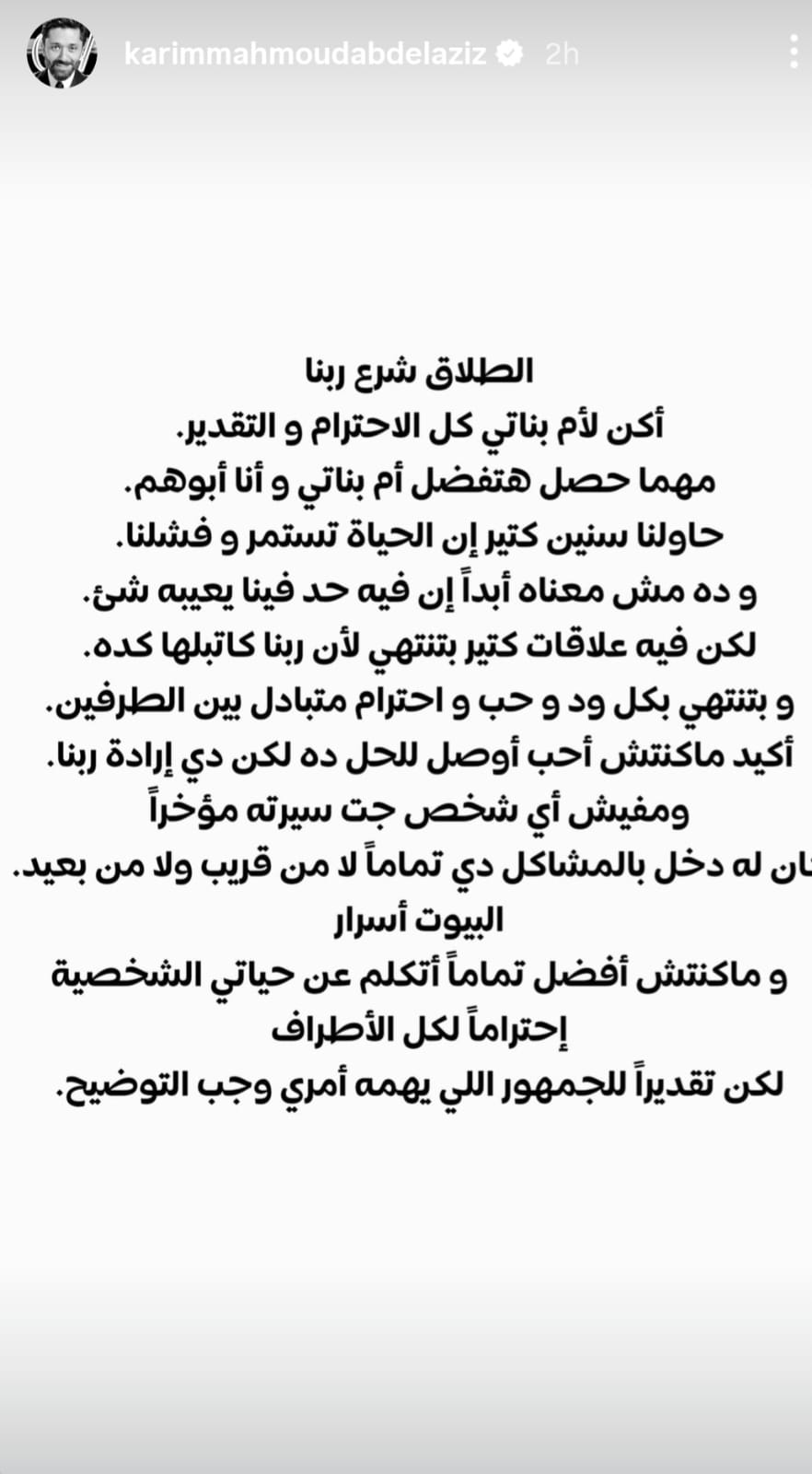 وقال كريم في بيانه الرسمي: “الطلاق شرع الله، وأكنّ لأم بناتي كل الاحترام والتقدير. مهما حدث، ستظلّ أم بناتي، وأنا سأظلّ والدهنّ. حاولنا طويلاً أن تستمر حياتنا معاً، لكننا فشلنا، وهذا لا يعني أن أحداً منا مخطئ، فالكثير من العلاقات تنتهي بمشيئة الله، وتنتهي بكل حب واحترام متبادل”.